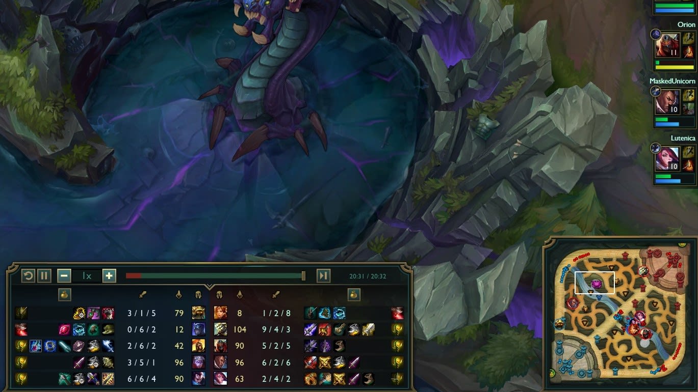 The overview of each player’s life bar and mana allows you to assess the overall situation, even if two fights occur simultaneously. You wouldn’t want to see every encounter happening at the same time. That would confuse even a veteran League of Legends fan. Instead, one can get a good sense of how the match is fairing with the sidebar.