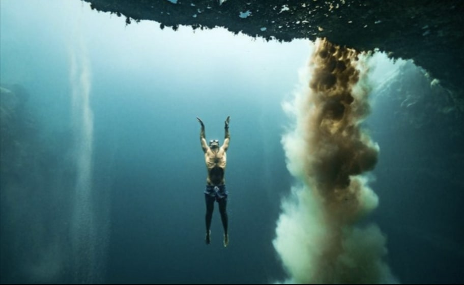 이 영상에는 프리다이버인 Anna von Boetticher와 Georgina Miller가 모래폭포가 쏟아지는 아래로 유유히 헤엄을 치는 모습을 담아내고 있는데요.