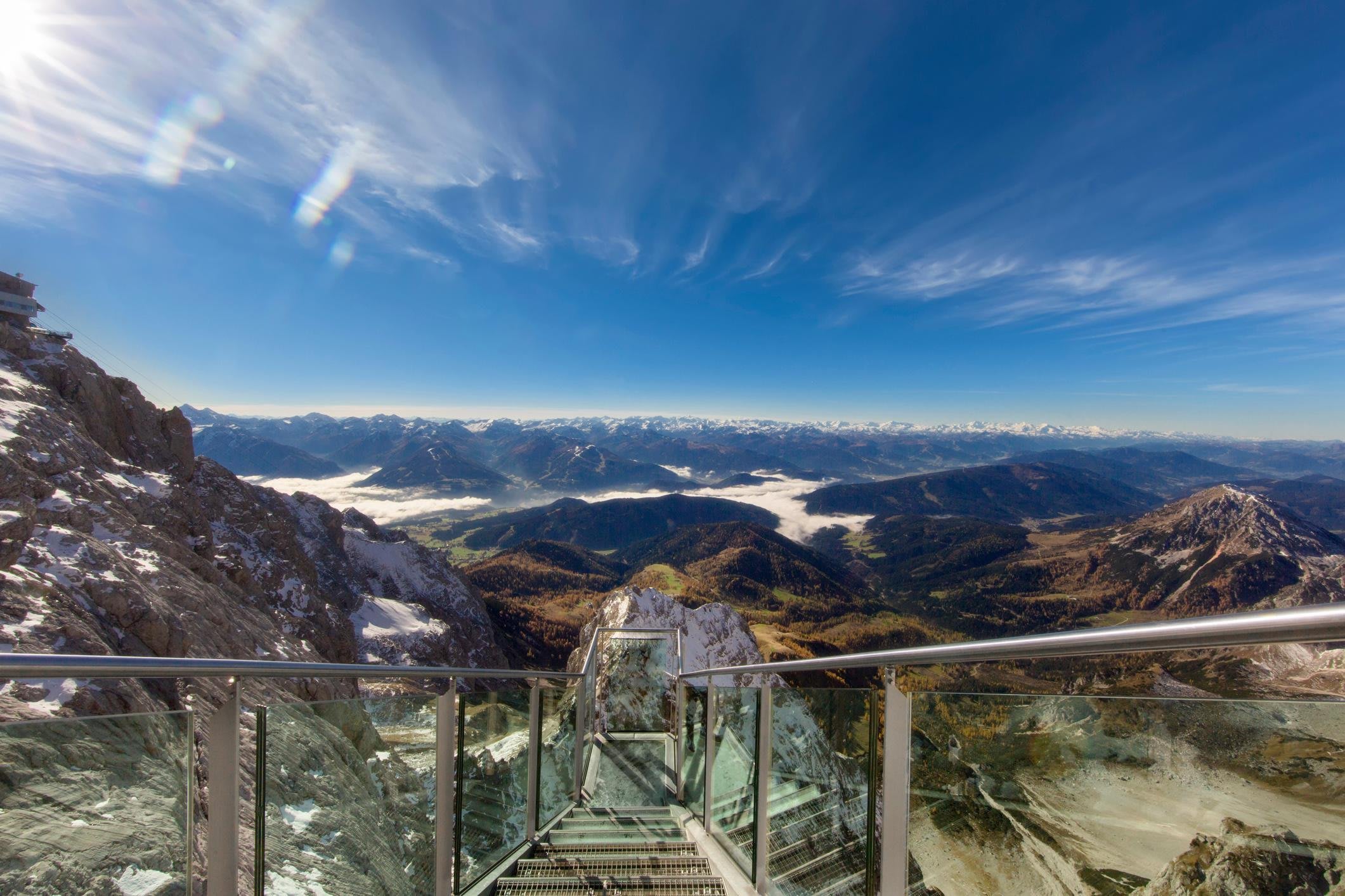 Это воздушное чудо расположено на высоте в 2 700 метров в Альпах и состоит из смотровой площадки со стеклянным дном, подвесного моста и лестницы в никуда - невероятного сооружения в 14 ступеней, которая открывает потярсающий вид на ледник Дахштайн.