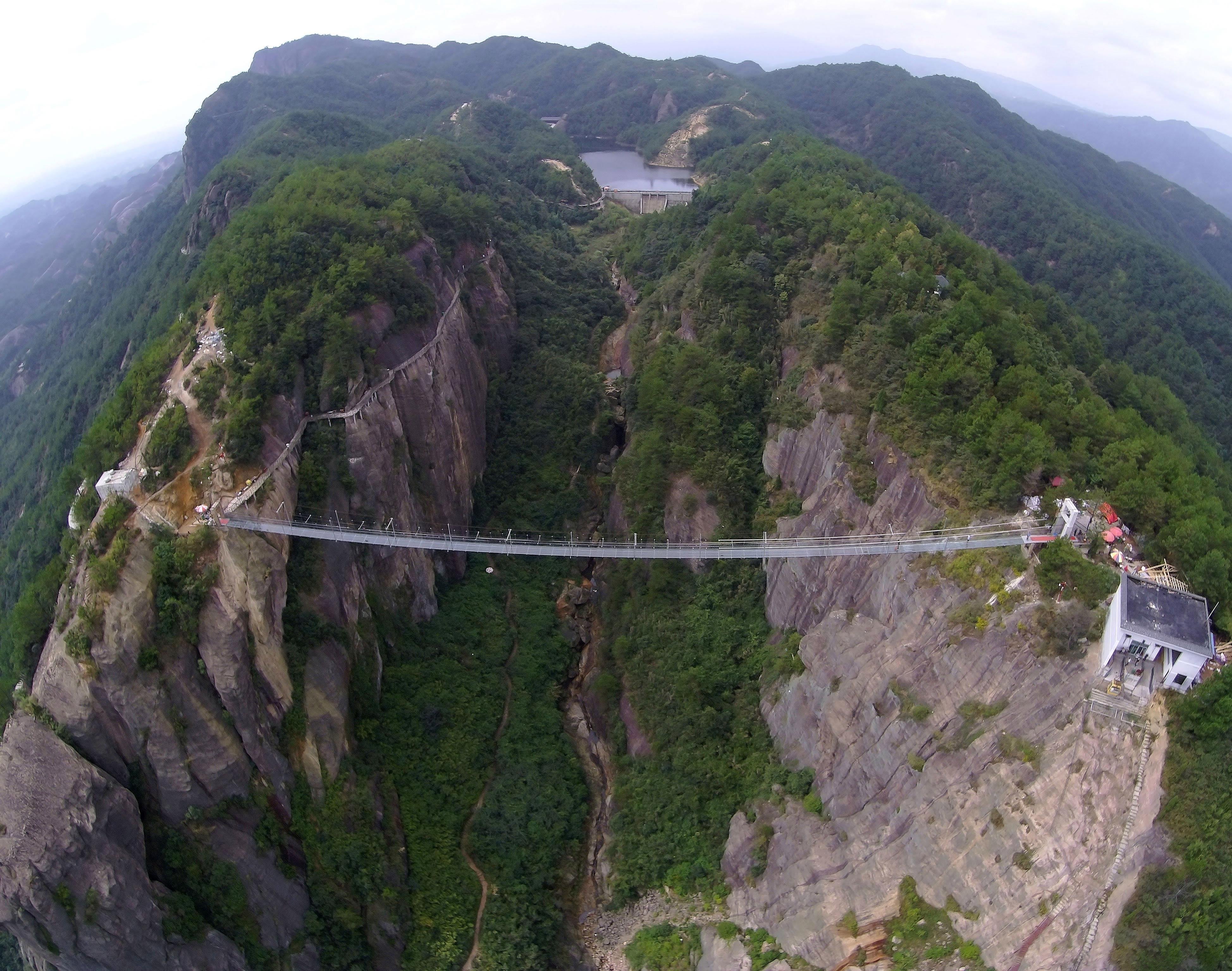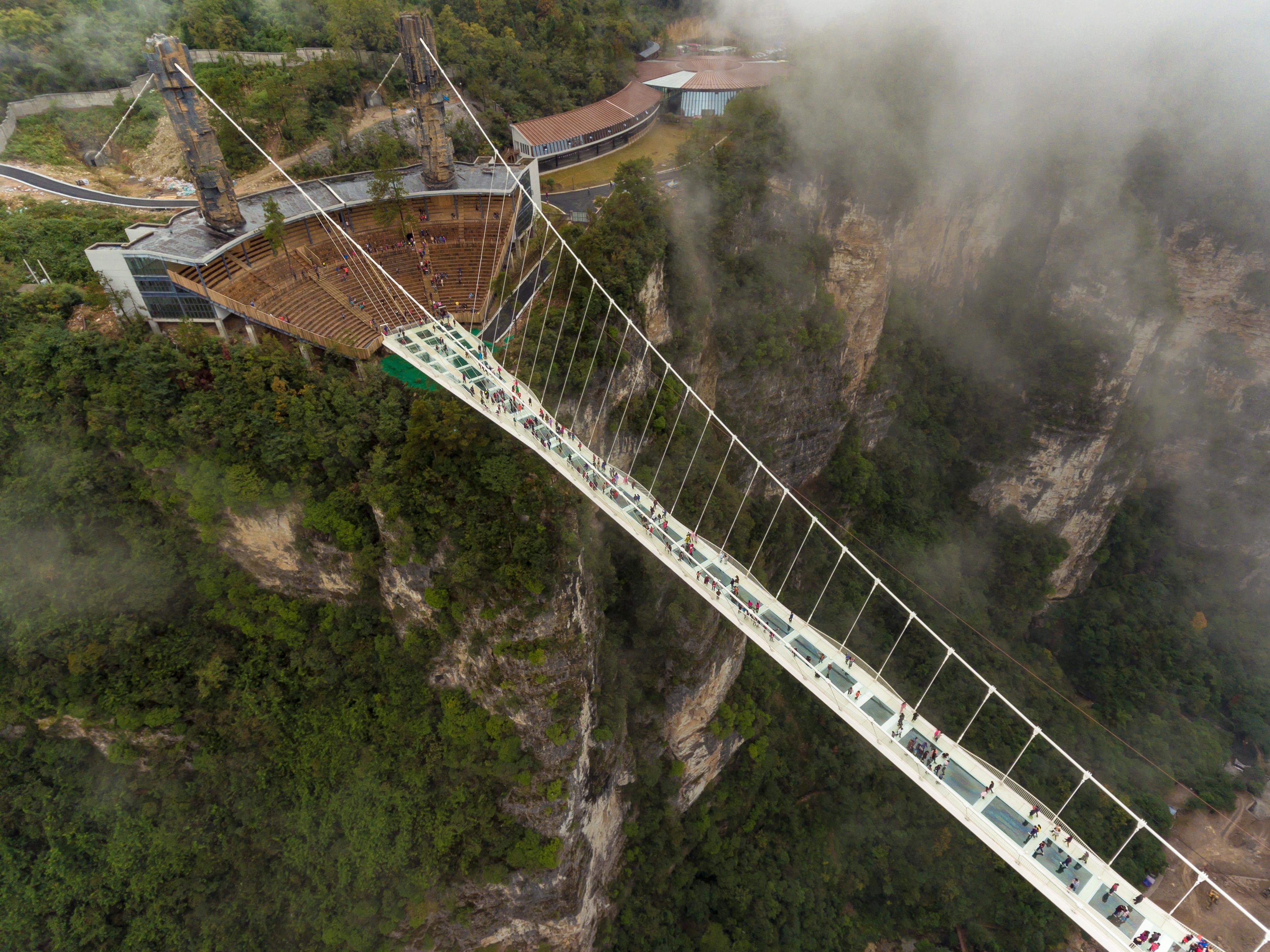 Этот пугающий 430-метровый мост расположен в 300 метрах над горной долиной и на сегодняшний день он длиннейший в мире. Чтобы доказать, что мост безопасен, по нему проехала машина, а одну из стеклянных панелей пытались разбить кувалдой.