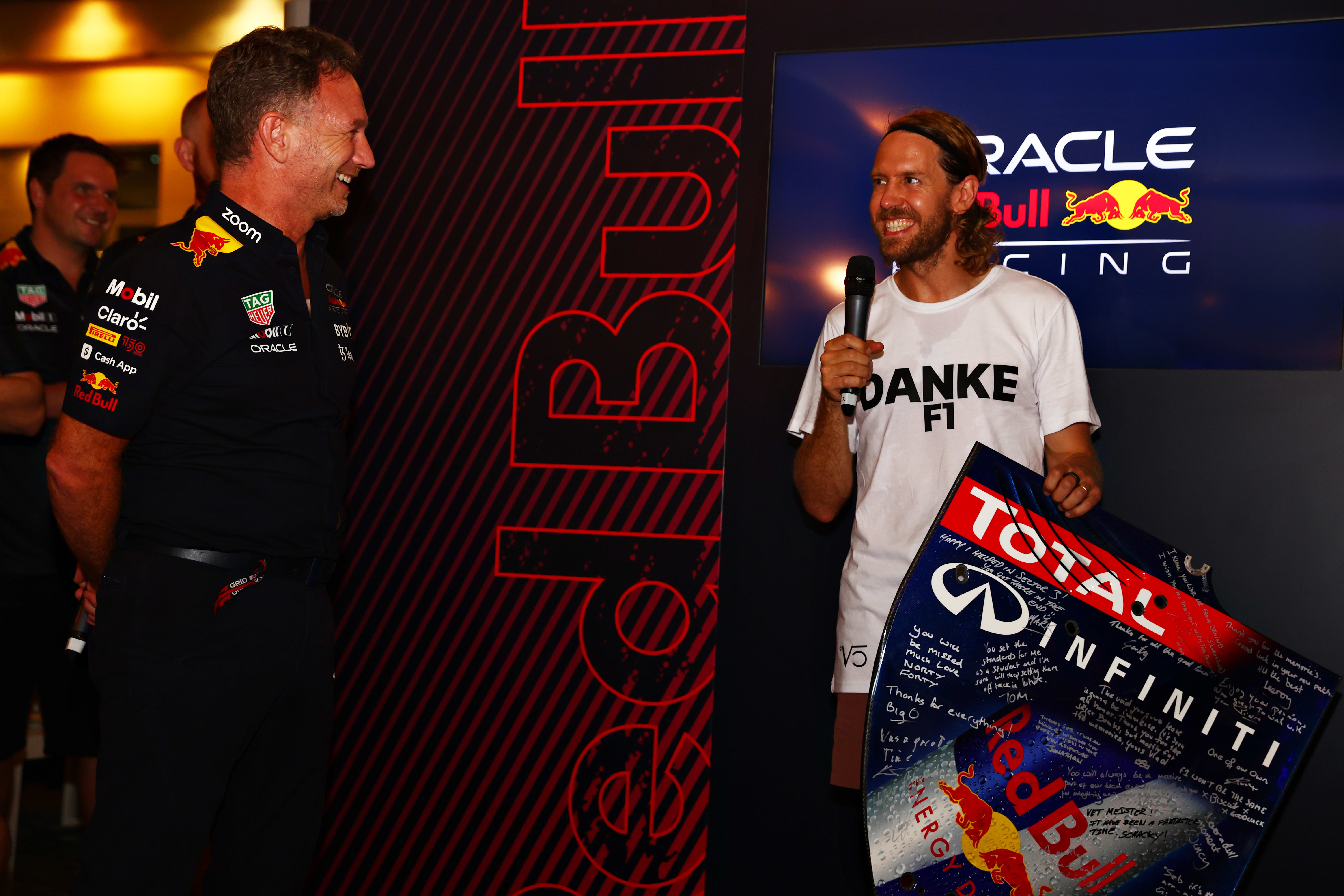 Vettel was presented with a rear wing endplate from his old team