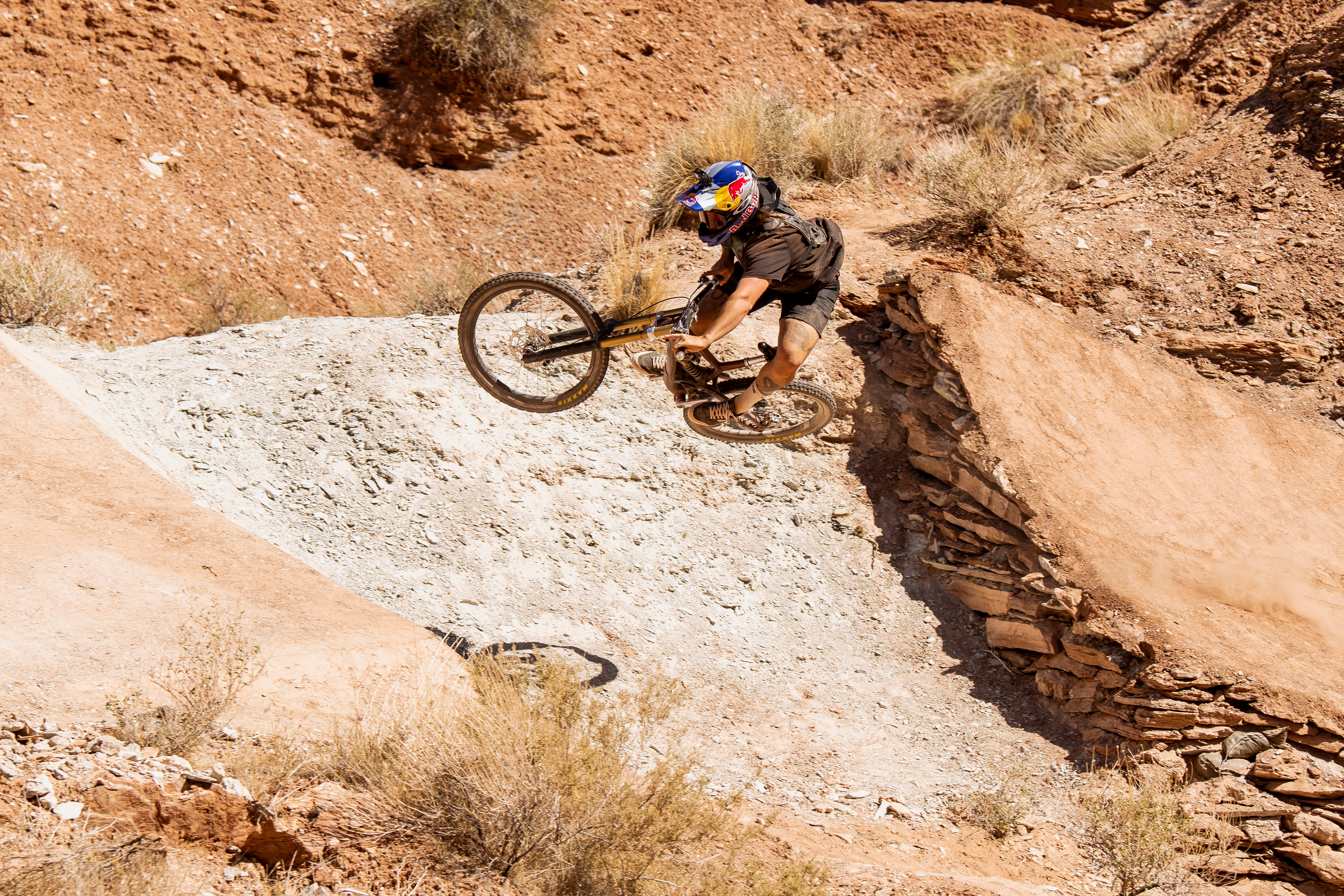 Remy Morton riding off a drop during his Red Bull Rampage video submission shoot in Virgin, Utah, in June 2022.