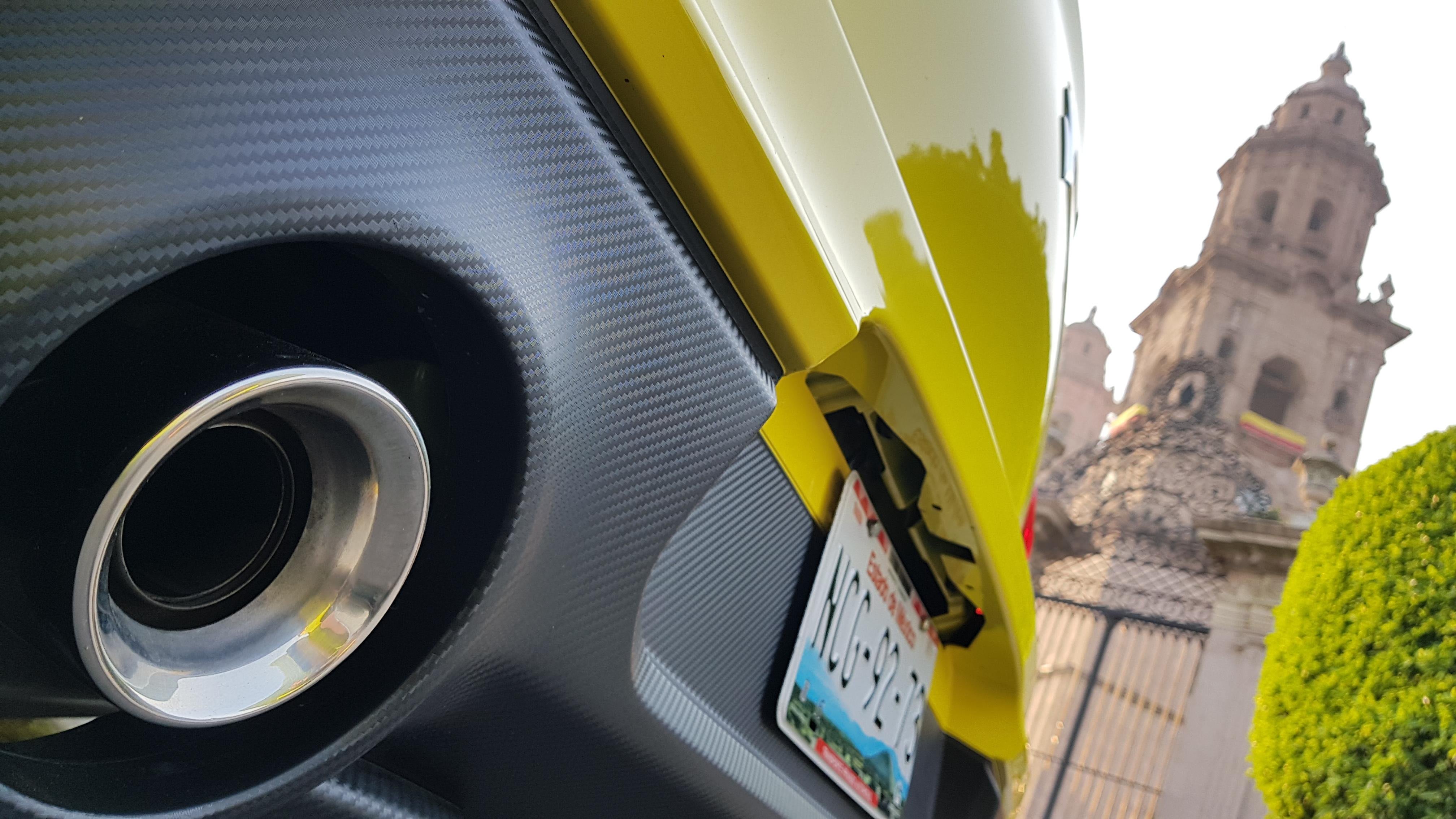 No hemos hablado de la apariencia exterior de este muchacho. Cara de enojado, pero a ti te dejará con una gran sonrisa. Chiquito, pero picoso. Zapatitos de buen tamaño (llantas 195/65 R16), sobre todo acorde a los horribles caminos mexicanos llenos de baches. Unos 17” se podría pensar que serían adecuados para un deportivo, pero esa pulgada menos se refleja en un andar directo, con una suspensión firme que se ha comportado excelente bajo presión. Nos dio sensación de manejar un go kart con una dirección muy directa, quizá un poco bailarín en la parte trasera al ser exigido, pero nada de qué preocuparse. En la parte trasera en el tema estético, doble escape que resalta el carácter deportivo, y un pequeño alerón sobre el medallón.