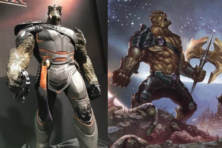 En los cómics, Corvus es la mano derecha de Thanos. Tiene un arma que supuestamente puede cortar cualquier material y que además lo hace inmortal.