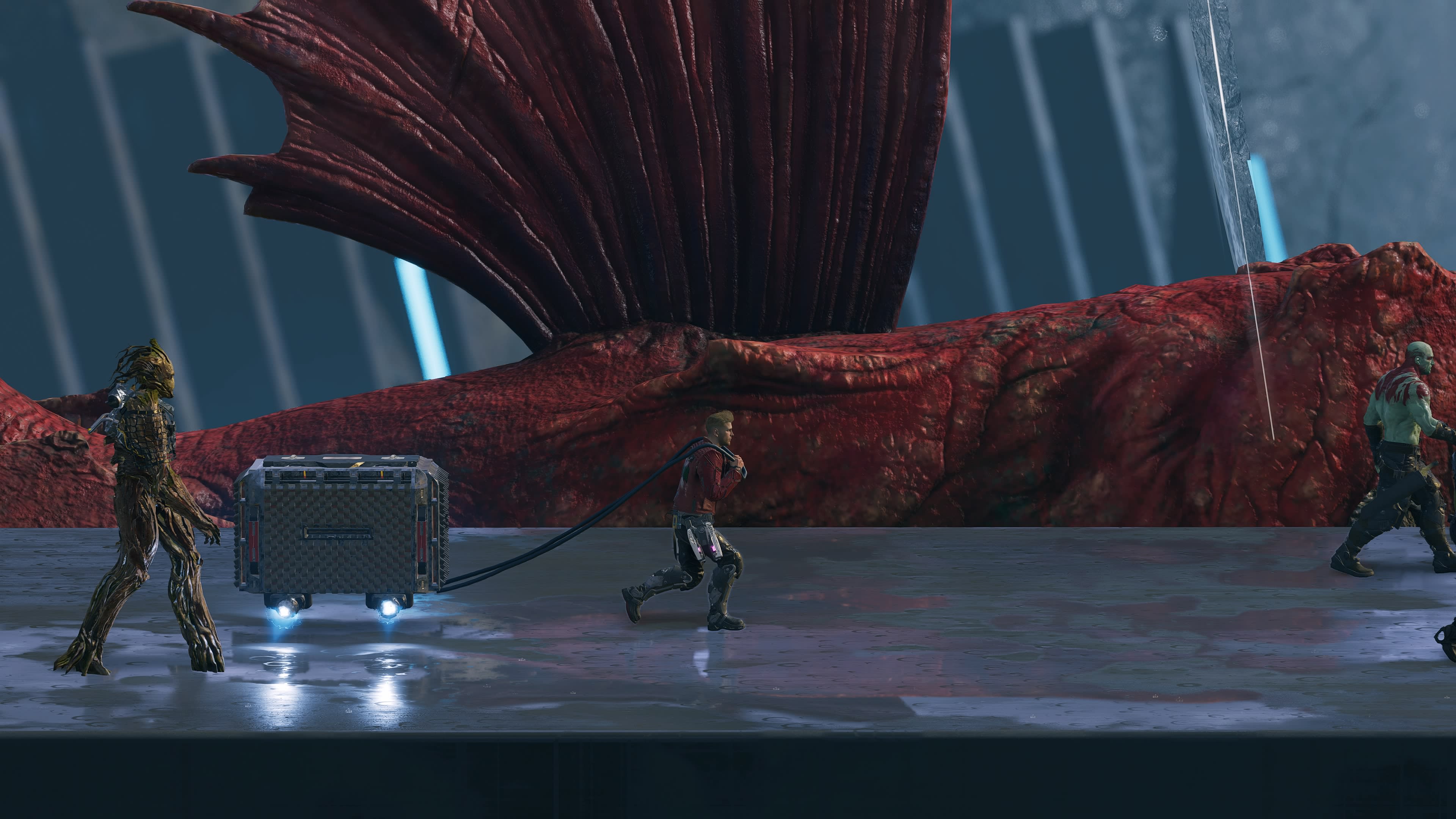 Tematicamente el juego trata sobre eso; la perdida y el duelo, el costo emocional que una guerra de esta escala tiene en los individuos que pertenecen a la sociedad galáctica. Aunque la circunstancia es diferente, en este titulo la historia de Peter Quill como Star-Lord también inicia con la perdida de su madre, todos los Guardianes y los personajes que conoces han perdido a alguien gracias a la guerra y es a través de esta herida abierta que la gran amenaza del juego se cuela a la galaxia. Si, el humor es esencial en las historias de los Guardianes de la Galaxia, pero también lo es el corazón y la narrativa de este juego entrega en los dos frentes.