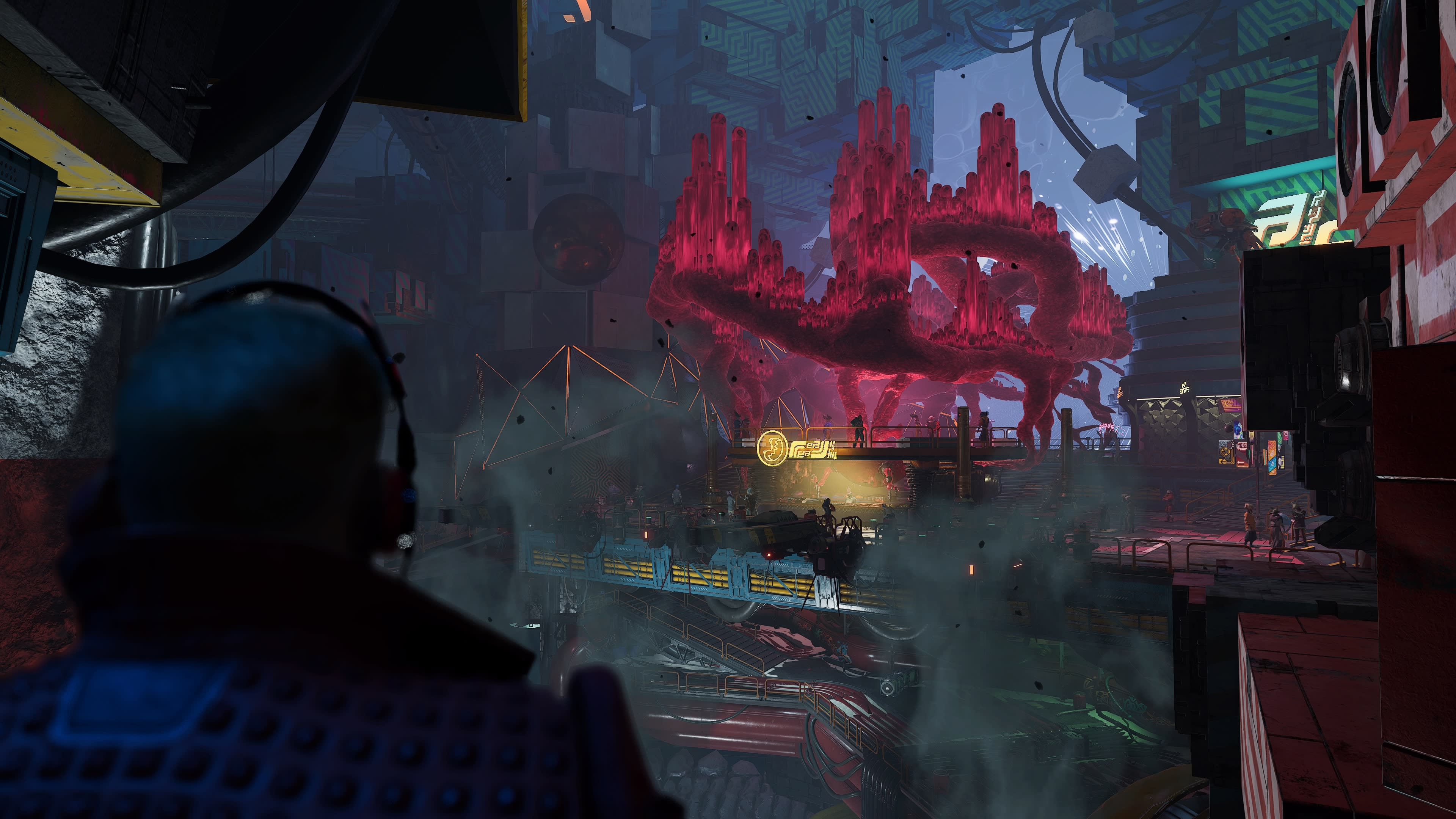 Los paisajes alienígenas que recorres en tu aventura galáctica son otro de los puntos altos del juego. Los paisajes son algunos de los mas hermosos y creativos que he visto en bastante tiempo. Lo mejor de todo es que efectivamente se sienten alienígenas, cada espacio tiene sus formas y colores dominantes, formas y colores que buscan alejarse de la arquitectura clásica terrestre e incluso se alejan de lo que hemos visto en clásicos de ciencia ficción. Tanto en el diseño de estos espacios como en el diseño de los alienígenas que te encuentras en Knowhere y otros lugares el espacio de Eidos-Montreal se voló la barda y dejo que su capacidad fluyera al máximo. Vas a querer caminar lento y avanzar sin prisas en las secciones de exploración para en verdad sumergirte en estos paisajes.
