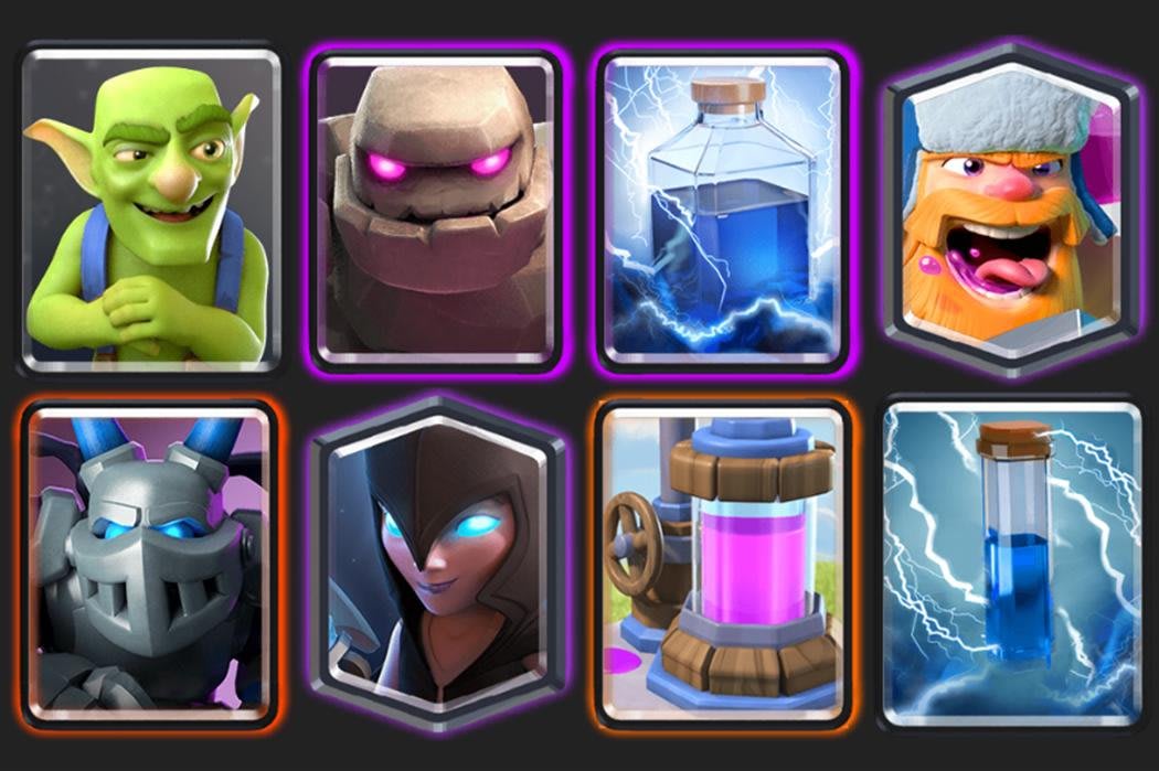 During the double-elixir phase, the deck can be played to its full potential. The Golem is the centrepiece of the deck and needs support units after he is played near the King tower.