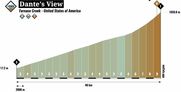 Mocht je nog puf overhebben, dan kan je ook nog Artists Drive aan je lijstje toevoegen. Een gemiddeld stijgingspercentage van 8,8%, wat dus meer is dan Dante's View, maar na 3.5 kilometer ben je er vanaf.