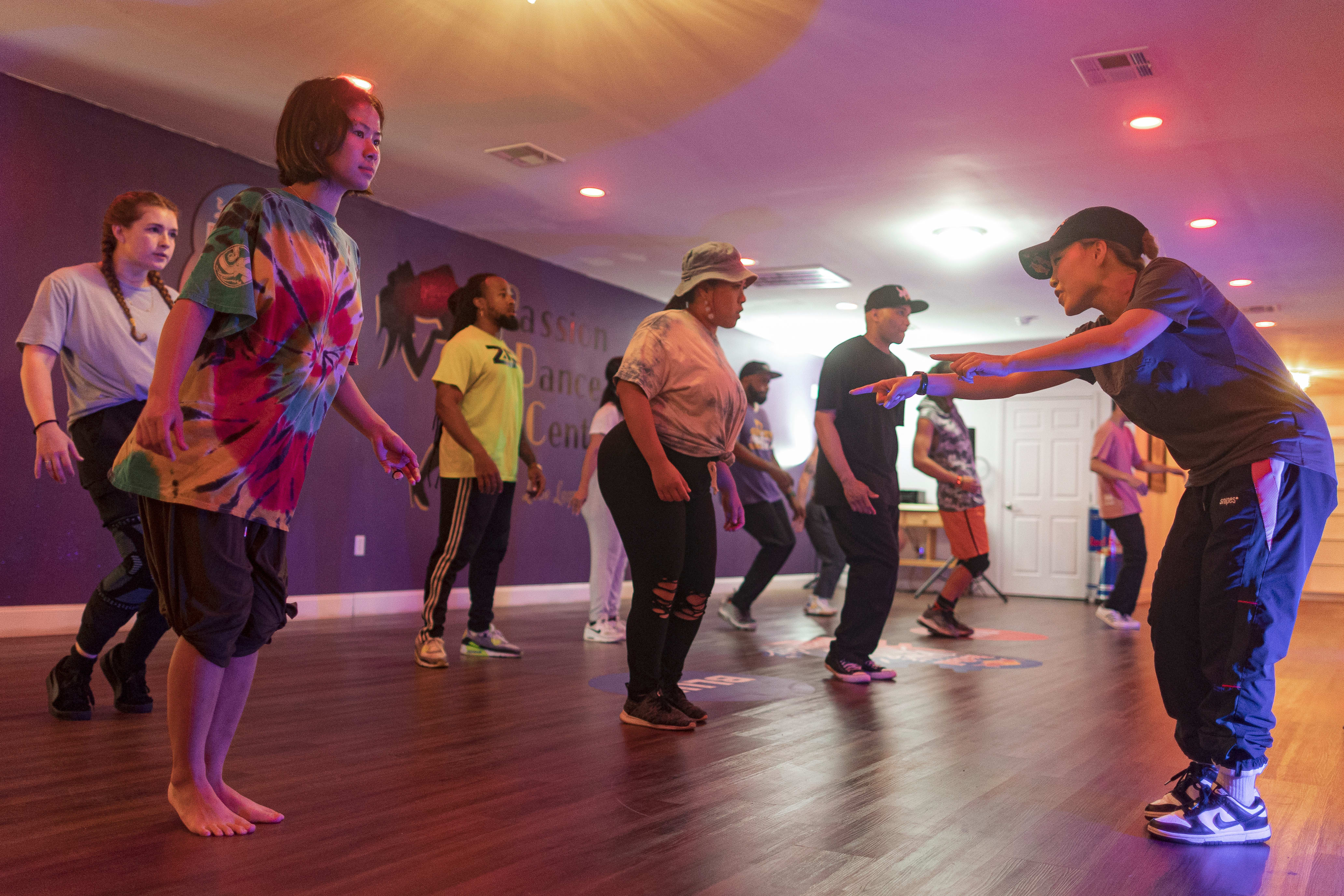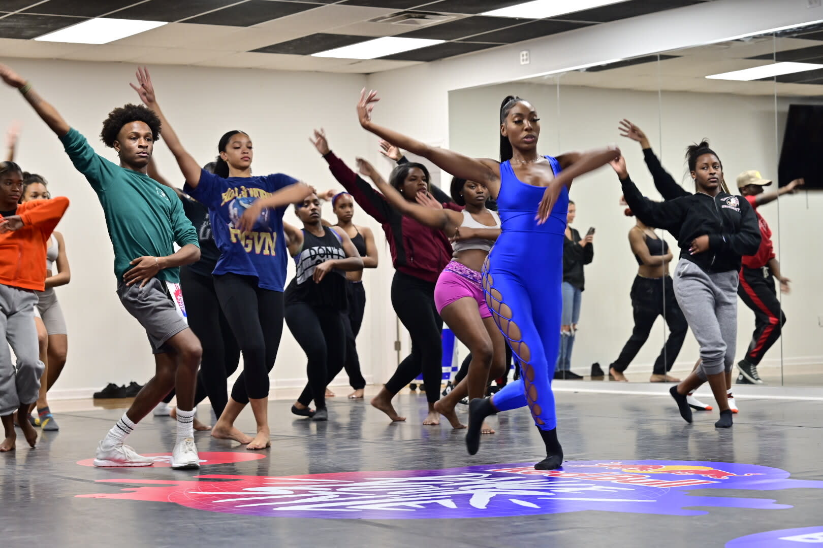 Naderah danst met deelnemers aan de FAMU Dance Your Style workshop.