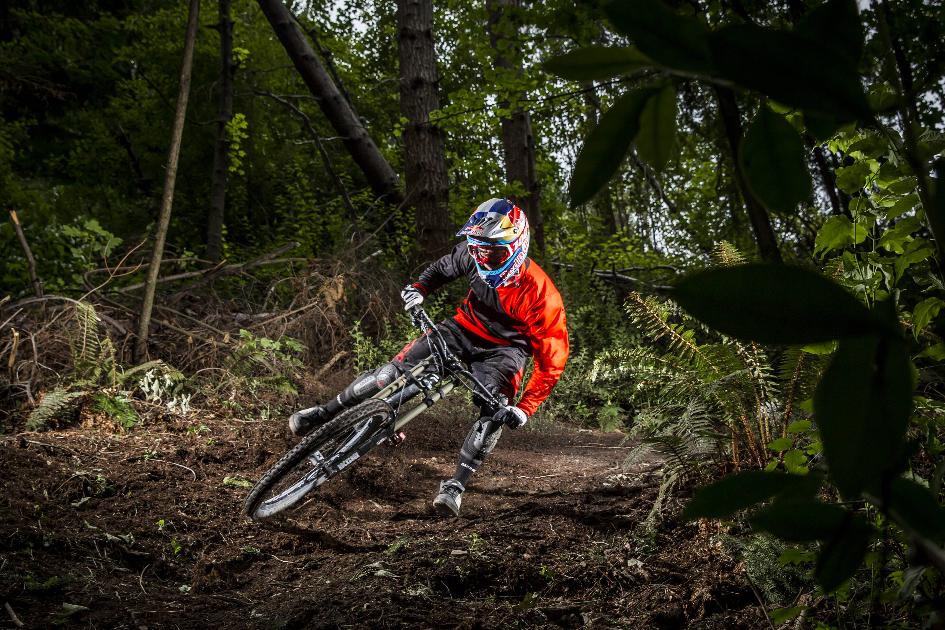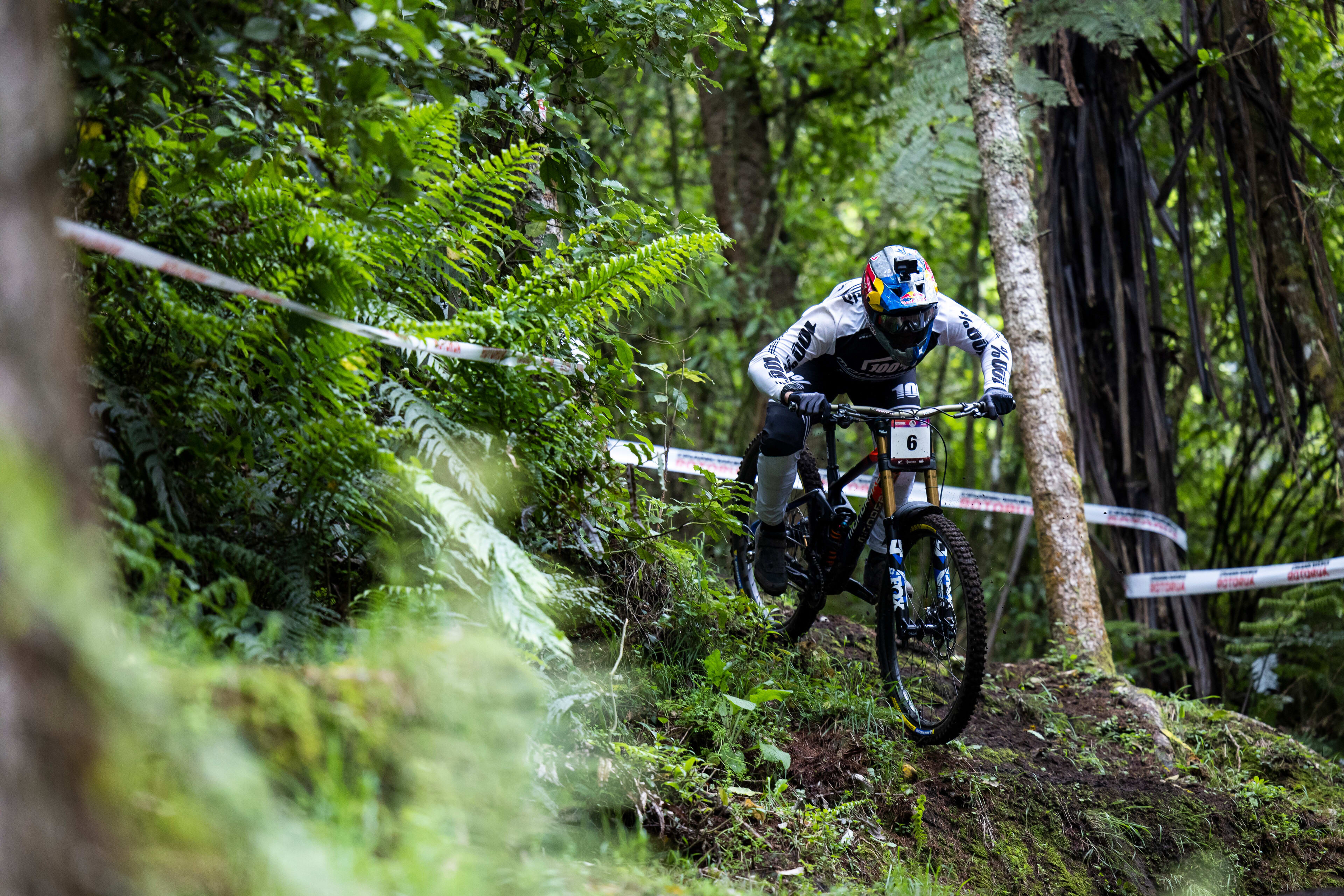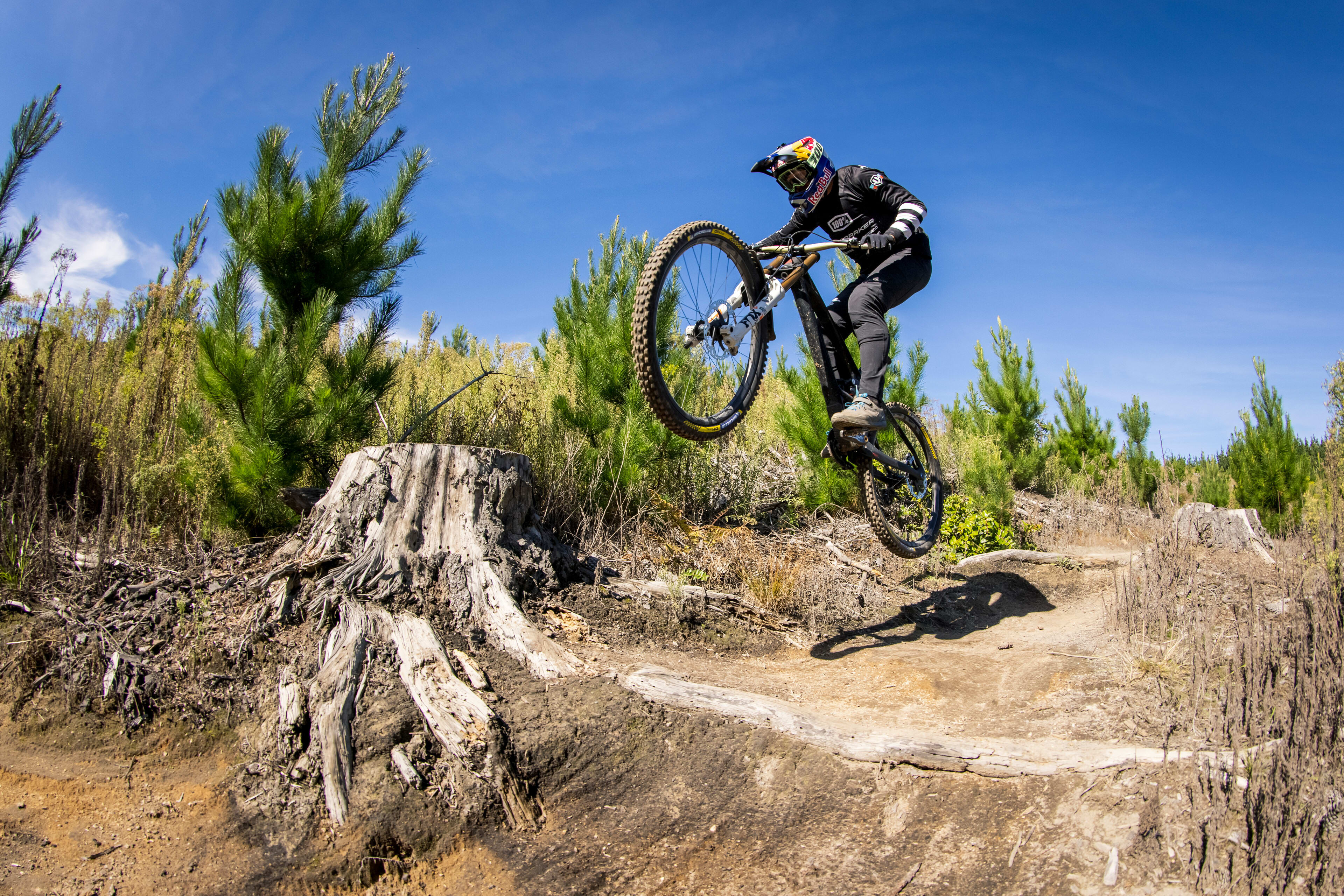 Wyn Master bike Dome Valley DH track in a steep and rough terrain in New Zealand. He starts off by moving through a section of woodland, then faces a series of hurdles with jumps and rock gardens