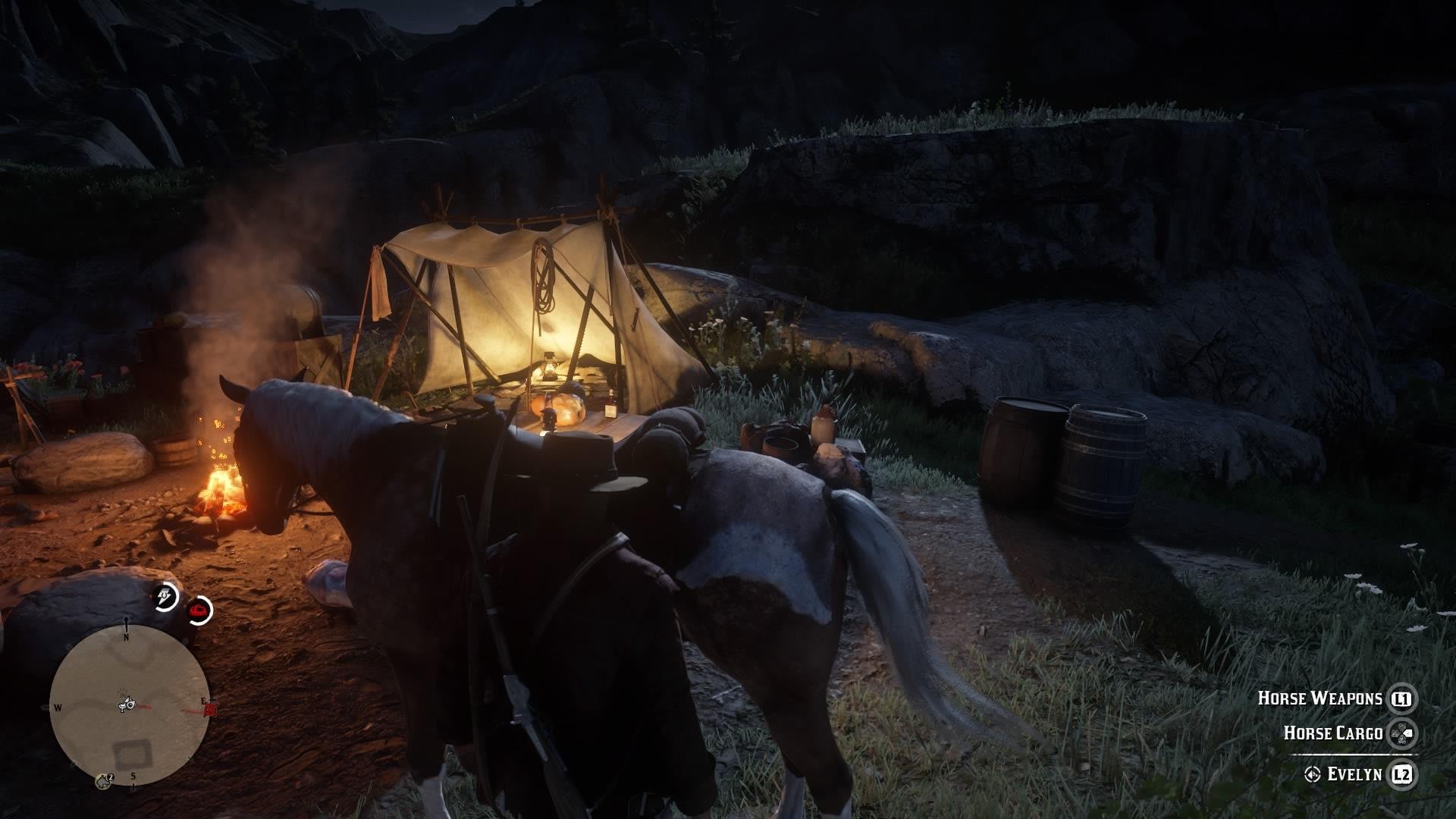 Tus caballos te ofrecen una mayor capacidad para tu inventario, y siempre que bajes del caballo para protagonizar un tiroteo o una partida de caza, asegúrate de elegir las herramientas adecuadas. Mientras tu fiel corcel cuida de todas tus armas, también te ayudará a guardar los animales cazados en su lomo. Si llevas una piel de un animal legendario o de un ciervo que quieres ofrecer a tu campamento, acércate a la parte trasera del caballo y presiona Cuadrado/X. Mientras vuelves a tu campamento, el cadáver no se descompondrá.