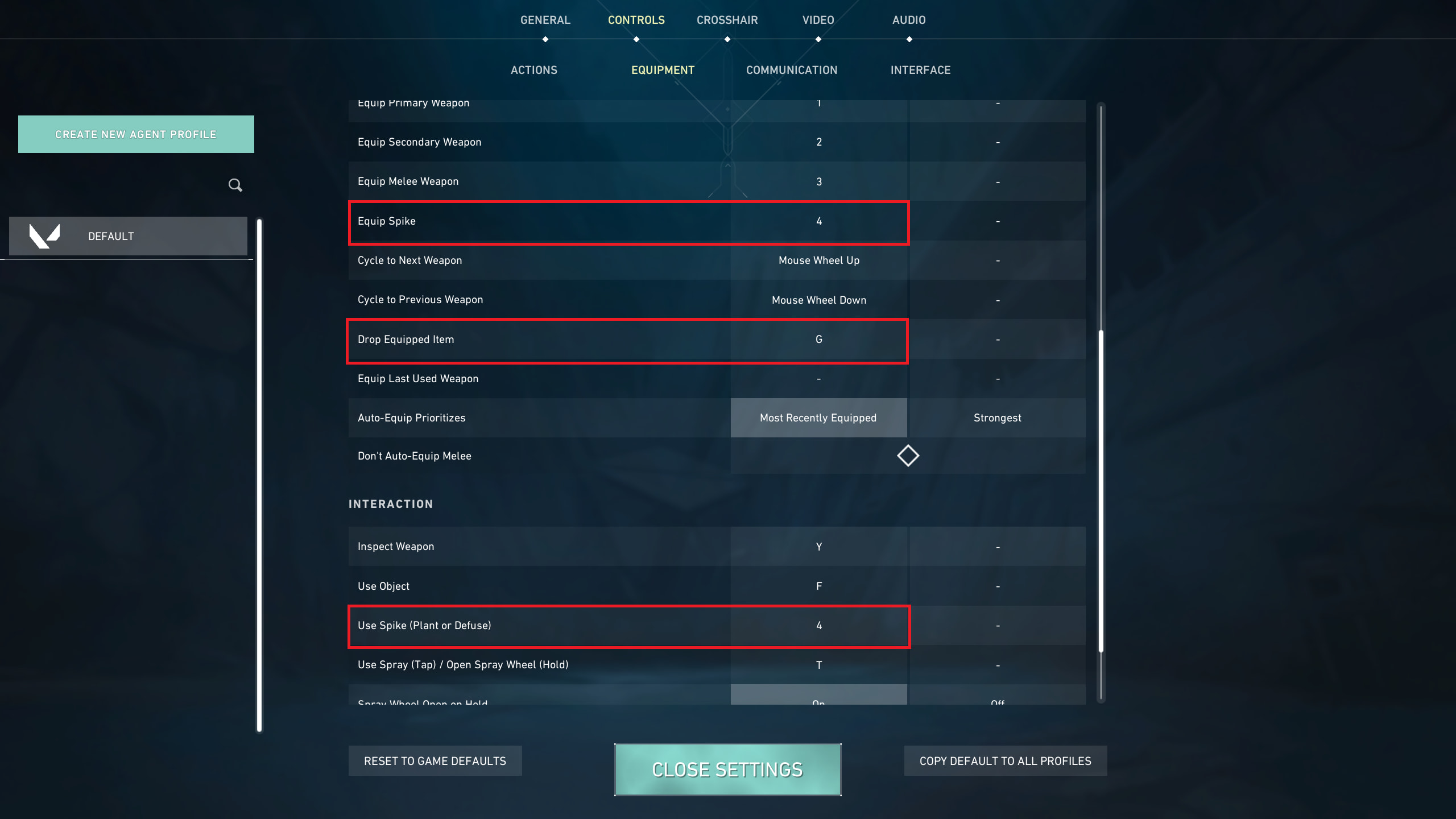 - Desplázate hacia abajo hasta el grupo Equipamiento y verás ‘Equip Spike’ con una clave por defecto de 4. Haz clic en ella e introduce la nueva clave que quieras.
