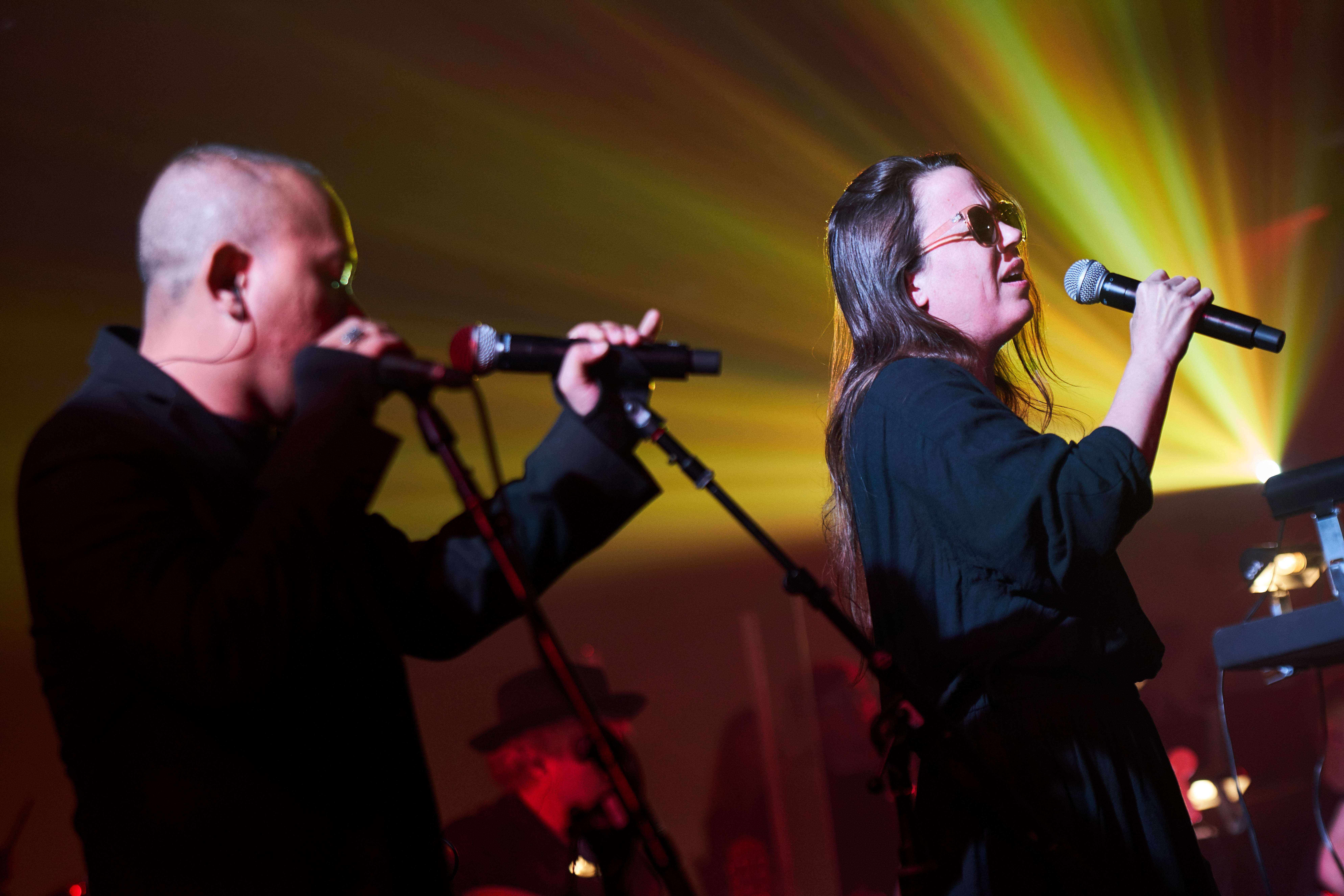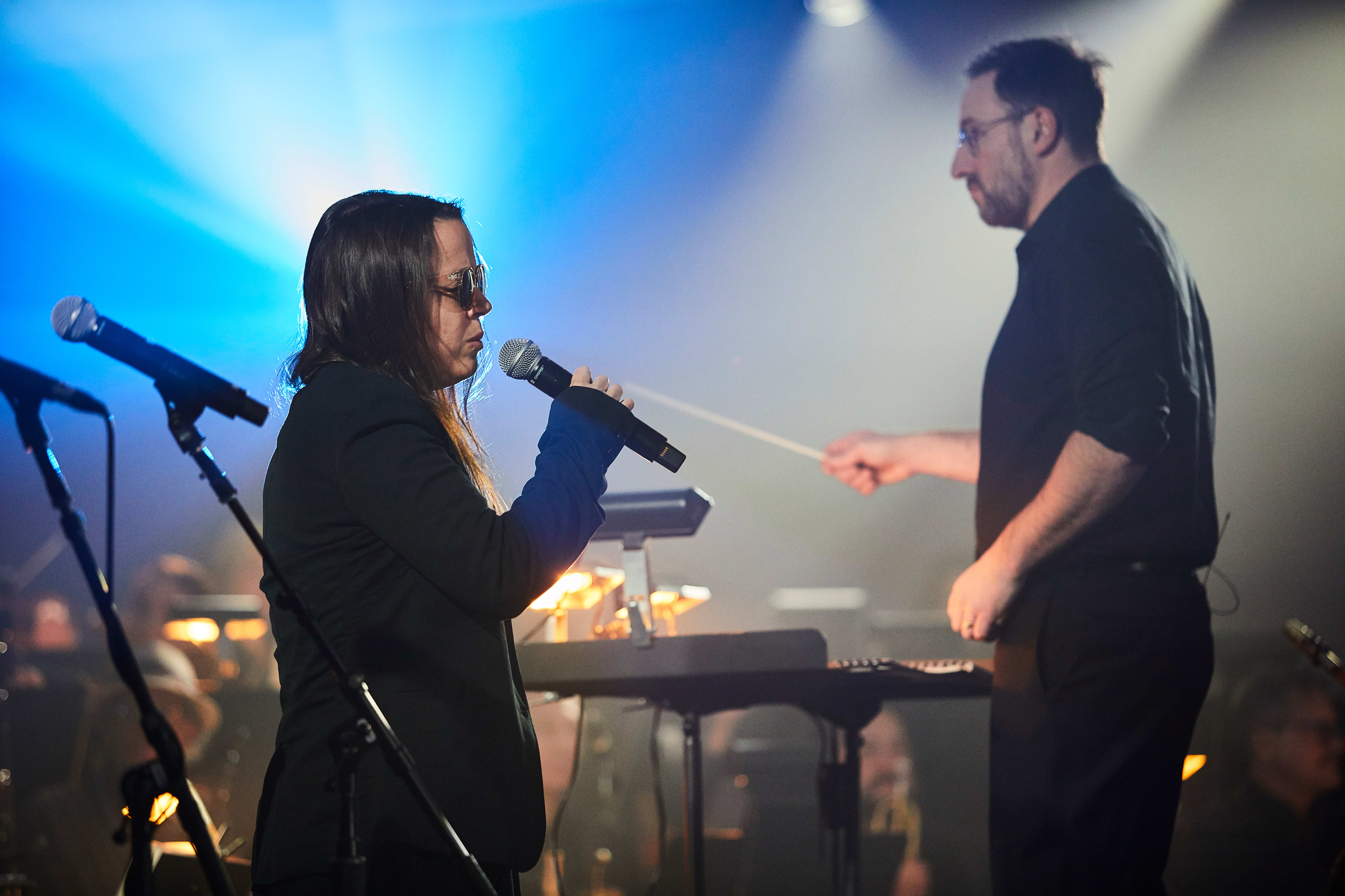 Woody sits there smiling, teetering under a yellow light. Shabara’s growls meander through the sound of metal scraping. ”Paradise Mercifully Departed” begins and the stage turns blood red. Shabara begins chanting and soon the orchestra follows, rising dramatically until it abruptly dissolves into the blissful groove of “A Rage Unleashed”.