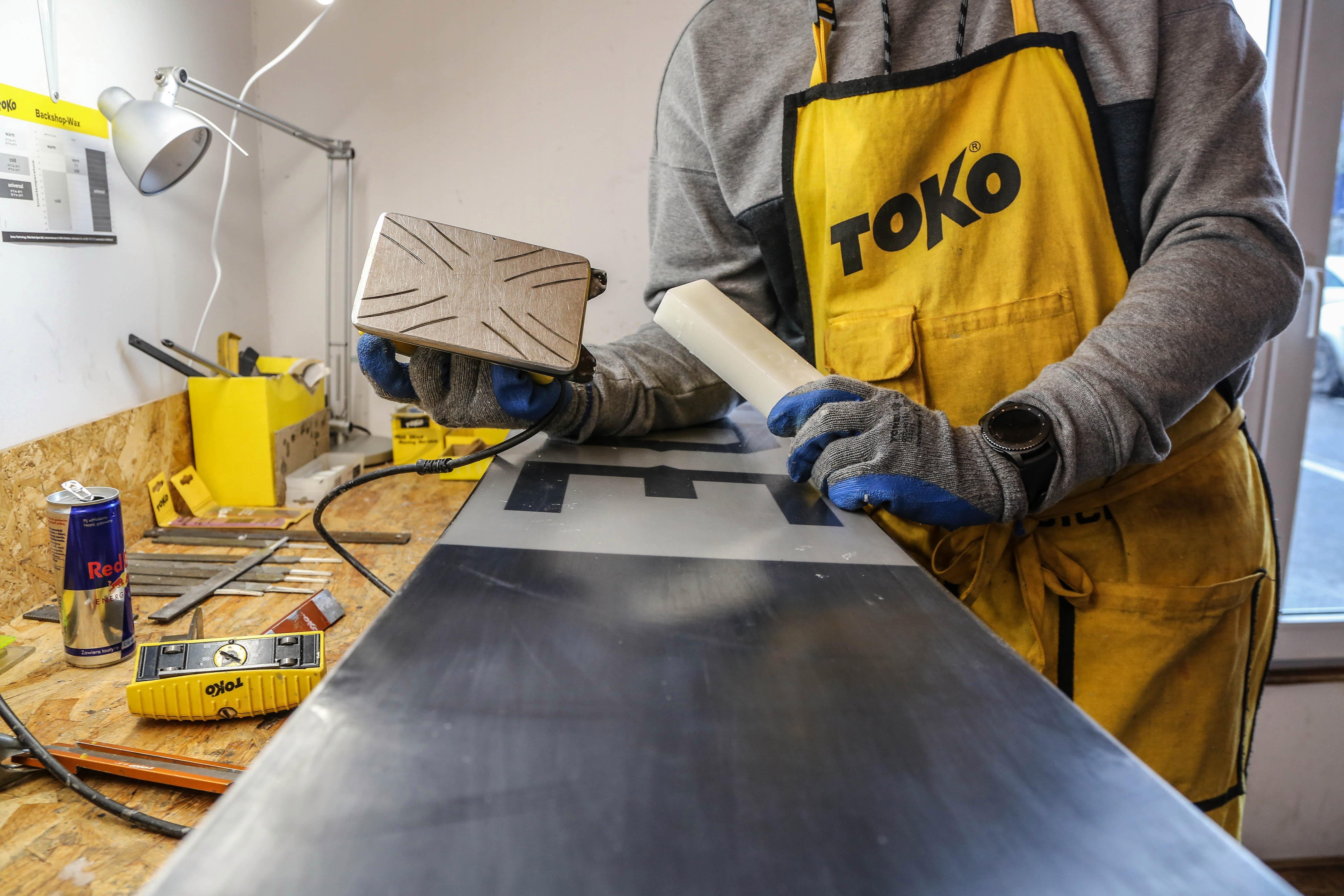 7. Smarowanie. Roztapiamy smar na ślizgu, a następnie „wprasowujemy” go w jego strukturę. Każdy smar dobieramy do panujących na stoku warunków. Główne czynniki decydujące o jego rodzaju to – temperatura śniegu, wilgotność, a także rodzaj śniegu.