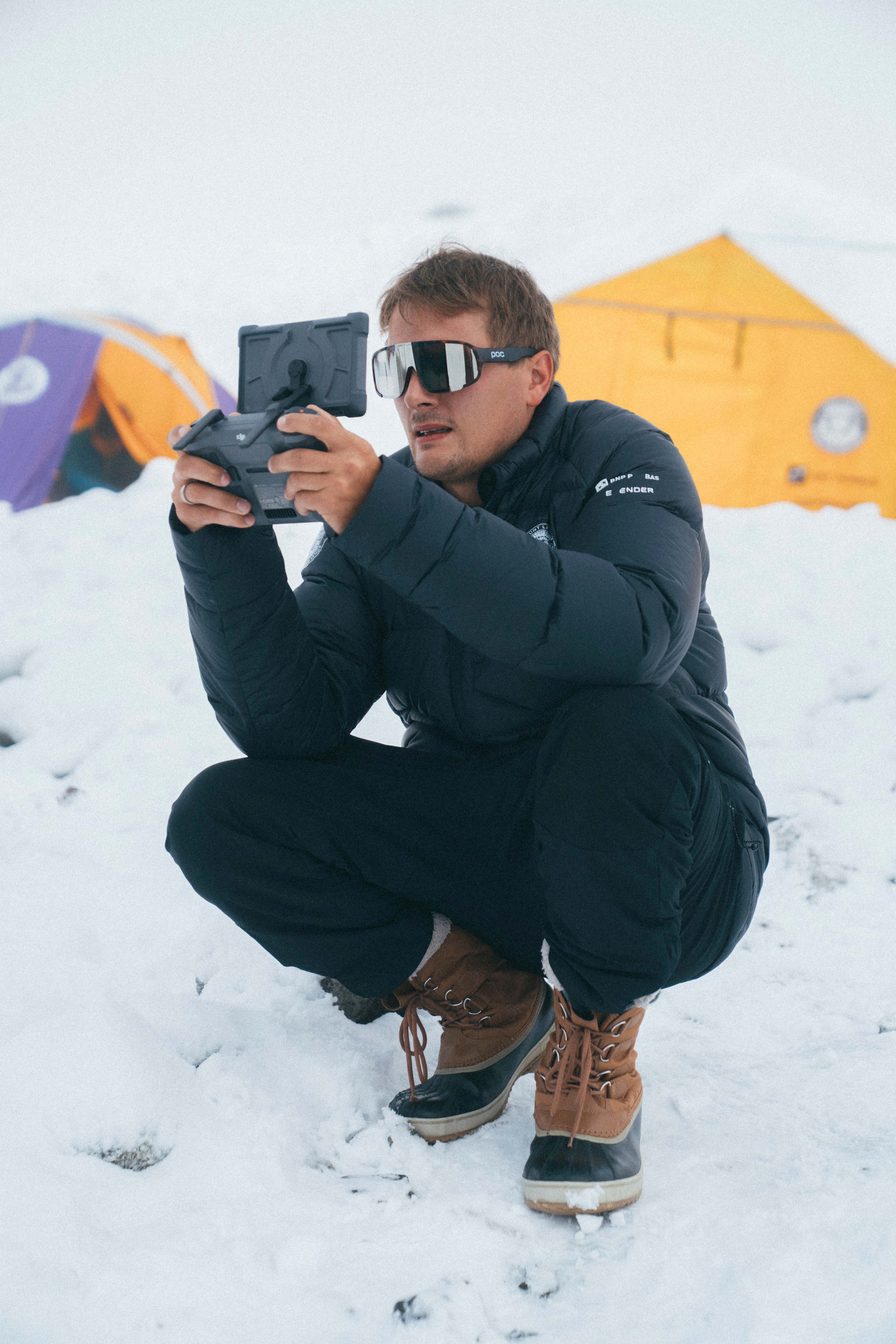 Byłem w obozie II. Tam miałem cały sprzęt: dwa drony, generator prądu na paliwo i Starlinka, żeby mieć łączność z internetem. Mieliśmy też zwykły namiot, w którym mogliśmy ładować drony. Maciek Sulima pomagał mi po lotach, przynosił baterie, podłączał te rozładowane do ładowania i dostarczał naładowane. Czasem pomagał też w komunikacji, bo kiedy leciałem dronem i miałem ręce na kontrolerze, nie byłem w stanie jednocześnie rozmawiać przez radio.