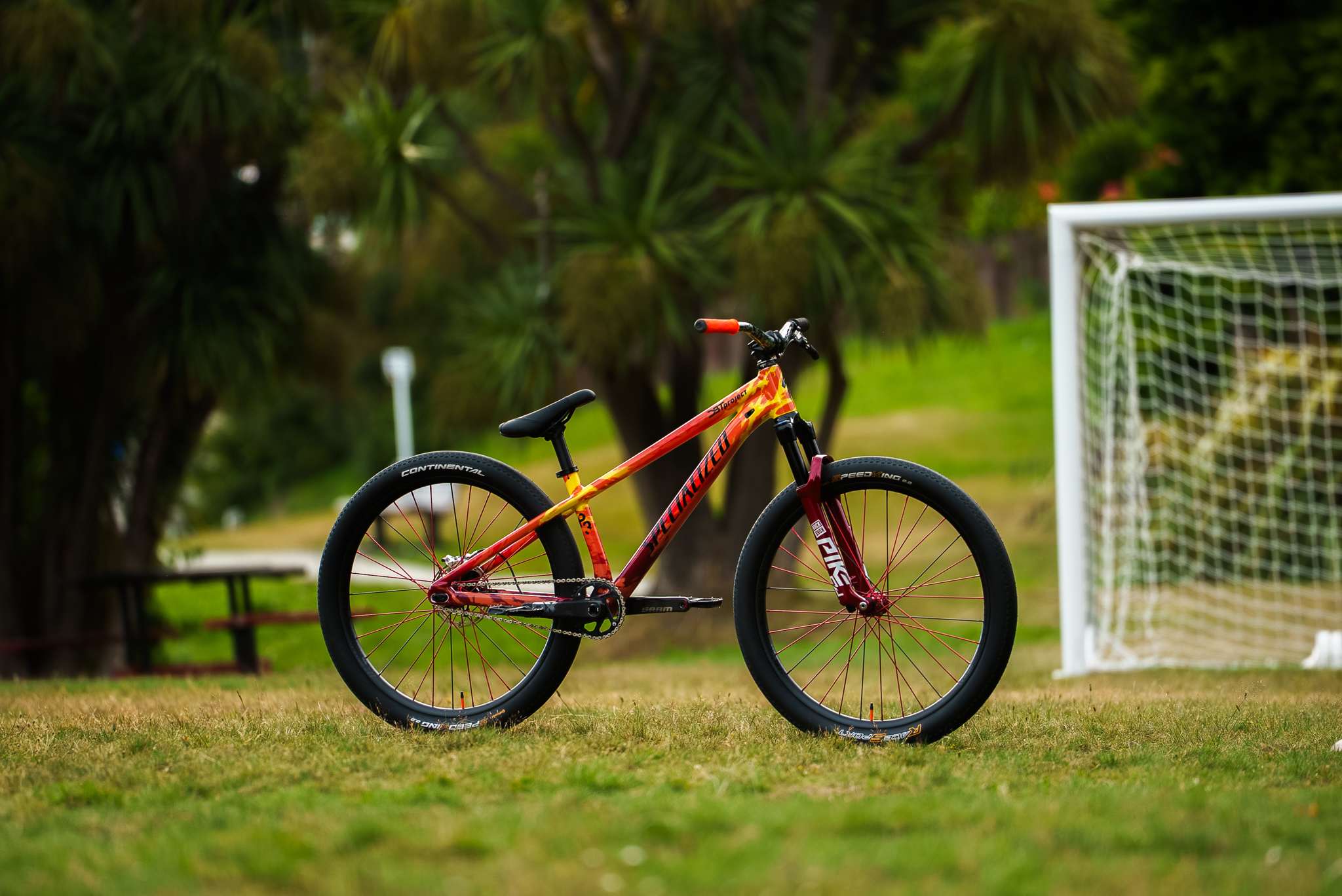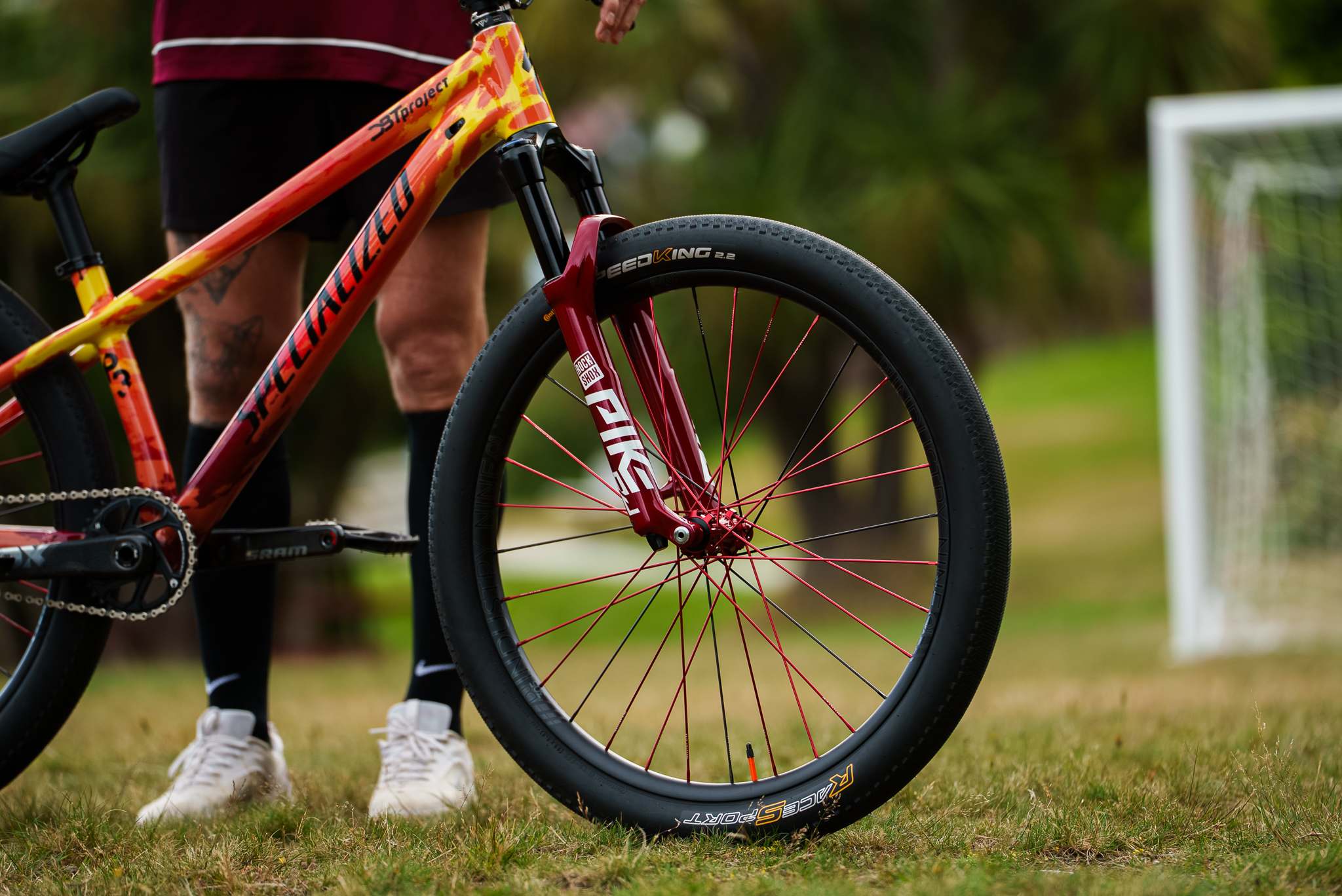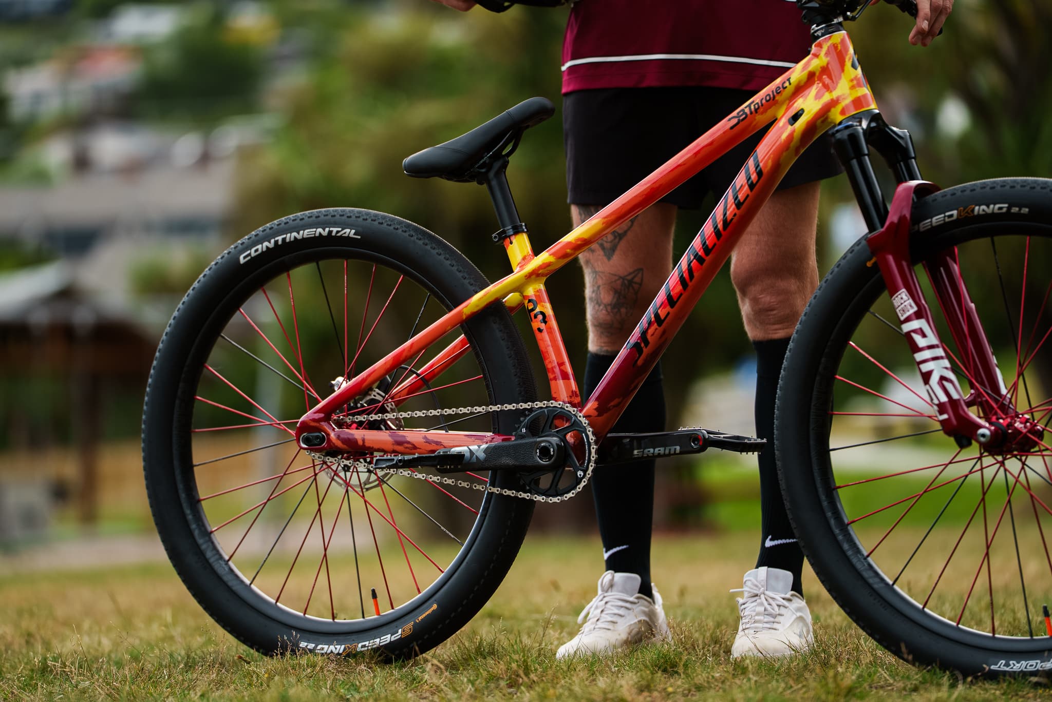 A mieliśmy pisać tylko o rowerze! Wracamy do tego, po co się tu dziś zebraliśmy. Nowa „rakieta” Dawida Godźka naprawdę robi wrażenie! Baza? Customowo pomalowany Specialized P3 z amortyzatorem RockShox Pike DJ. Koła Industry Nine - prosty wybór! Do tego komponenty SRAM-a, opony Continentala i kilka elementów biżuterii od firmy Signature, prowadzonej przez slopestyle’ową legendę - Bretta Rheedera.