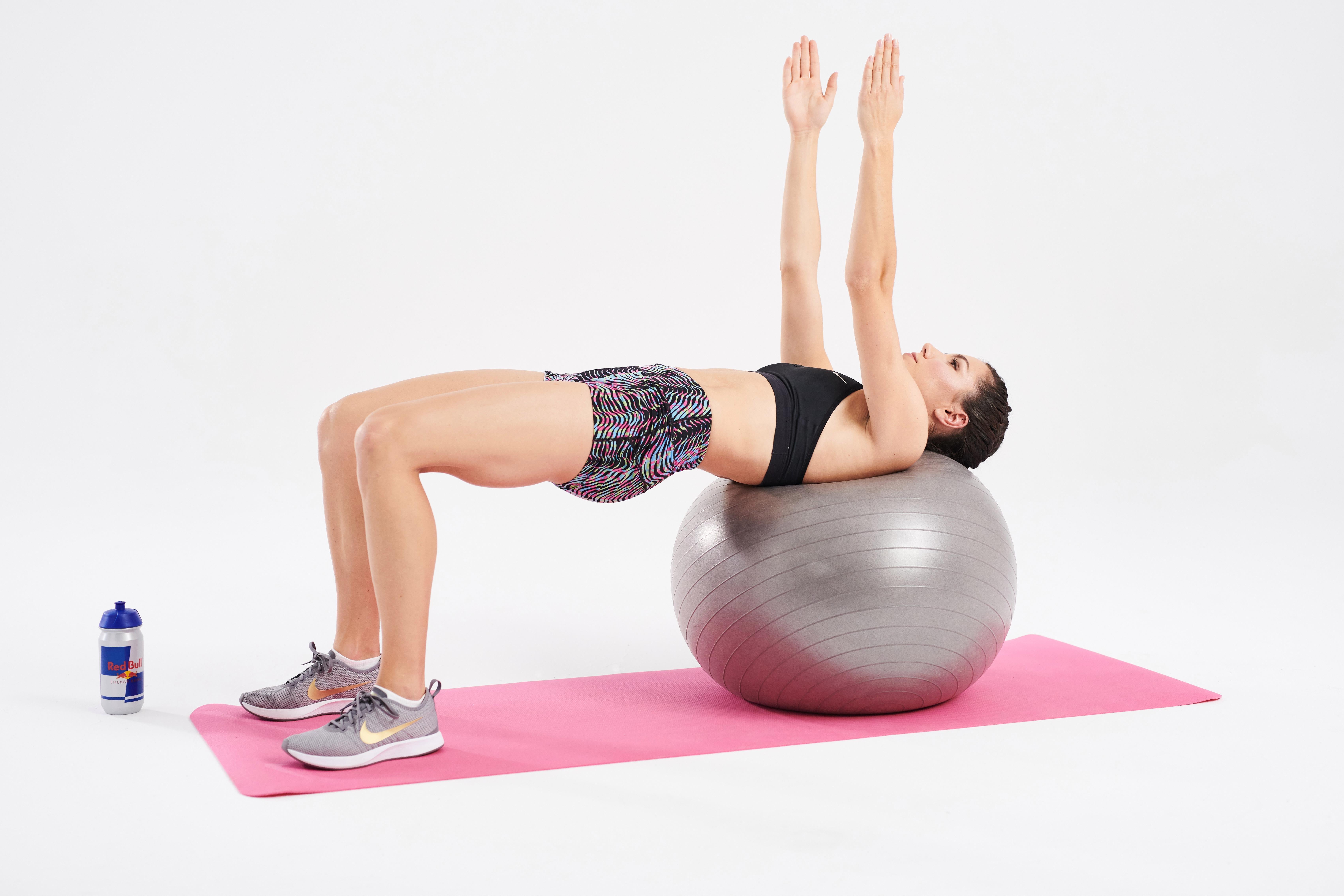 Kładziemy się na piłce tyłem. Powinna znaleźć się pod łopatkami. Brzuch i pośladki mocno napięte. Uginamy kolana pod kątem 90 stopni. Ręce wyciągamy do góry – przed siebie. Wykonujemy skręty tułowia.