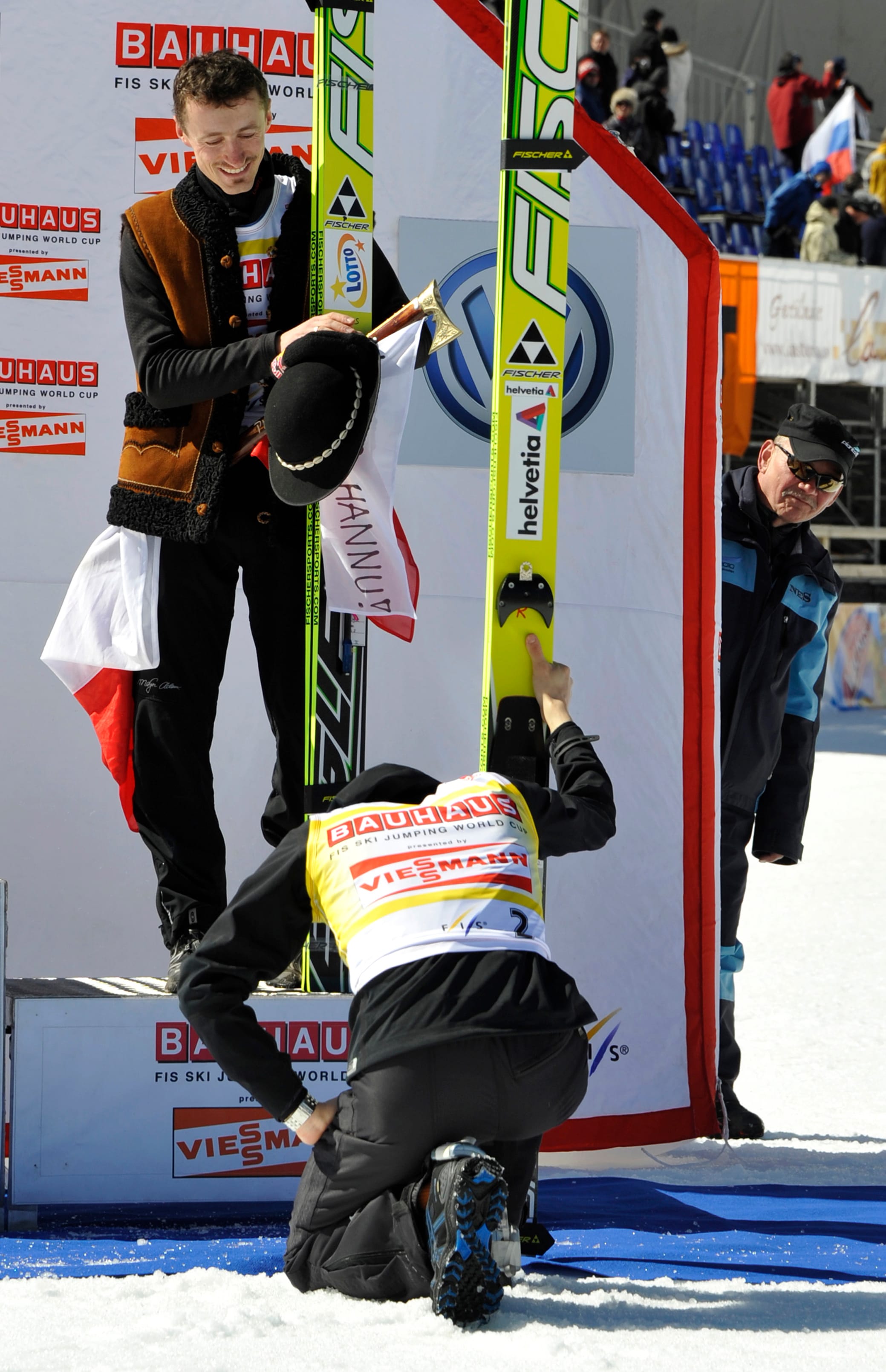 Jedyny moment, w którym Małyszowi zrobiło się przykro, wydarzył się podczas dekoracji. Stał na najwyższym podiom, ale nie zagrano mu Mazurka Dąbrowskiego. Wytłumaczył to sobie tak: „Adam, jeszcze ci zagrają tego Mazurka Dąbrowskiego”. Półtora miesiąca później, w Lahti, został mistrzem świata. I zaśpiewał hymn.