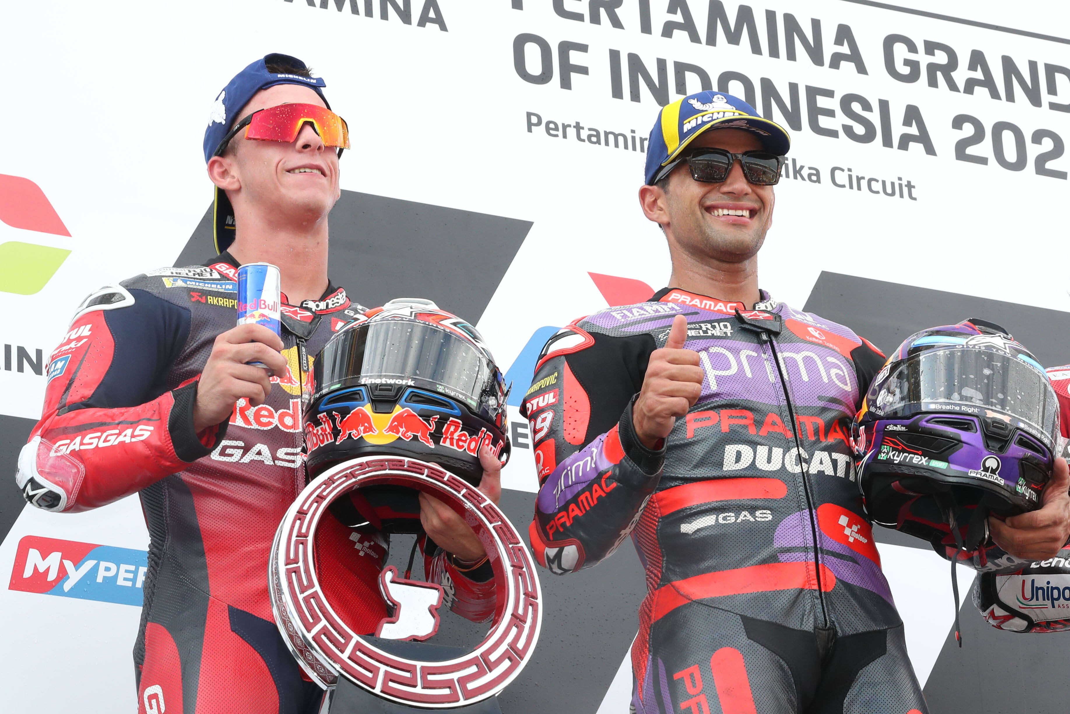 Niedzielny wyścig MotoGP miał już zupełnie inny przebieg. Martin ponownie objął prowadzenie w pierwszym zakręcie i tym razem nie popełnił już błędu. Jorge pewnie przewodził stawce, a gdy próbował go gonić drugi Acosta – nie pozwolił rywalowi na dogonienie go. W samej końcówce zawodnik Pramac Racing utrzymał świetne tempo i na metę wpadł z bezpieczną przewagą. Jorge Martin tym samym wygrał GP Indonezji, przy okazji zgarniając pierwszy triumf w wyścigu głównym od czasu GP Francji w maju! Drugi na finiszu był tegoroczny debiutant Pedro Acosta, dla którego to czwarte podium w tym roku, a TOP3 uzupełnił Pecco Bagnaia.