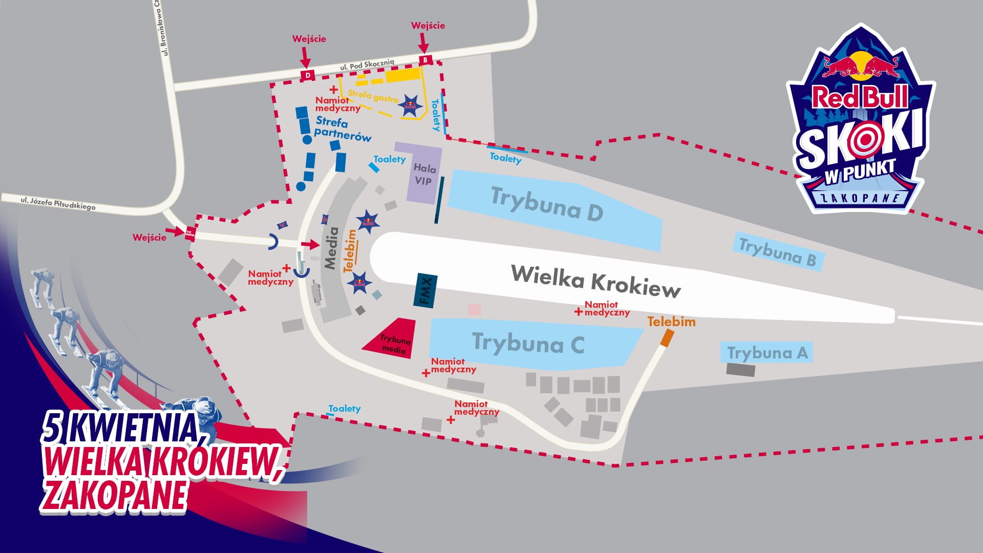 W sobotę 5 kwietnia spotykamy się na legendarnej Wielkiej Krokwi przy ulicy Bronisława Czecha 1 w Zakopanem. Arena Red Bull Skoki w Punkt znajduje się niespełna 2 kilometry od słynnych Krupówek i ścisłego centrum. Prowadzą do niej ulice Józefa Piłsudskiego oraz Bronisława Czecha.