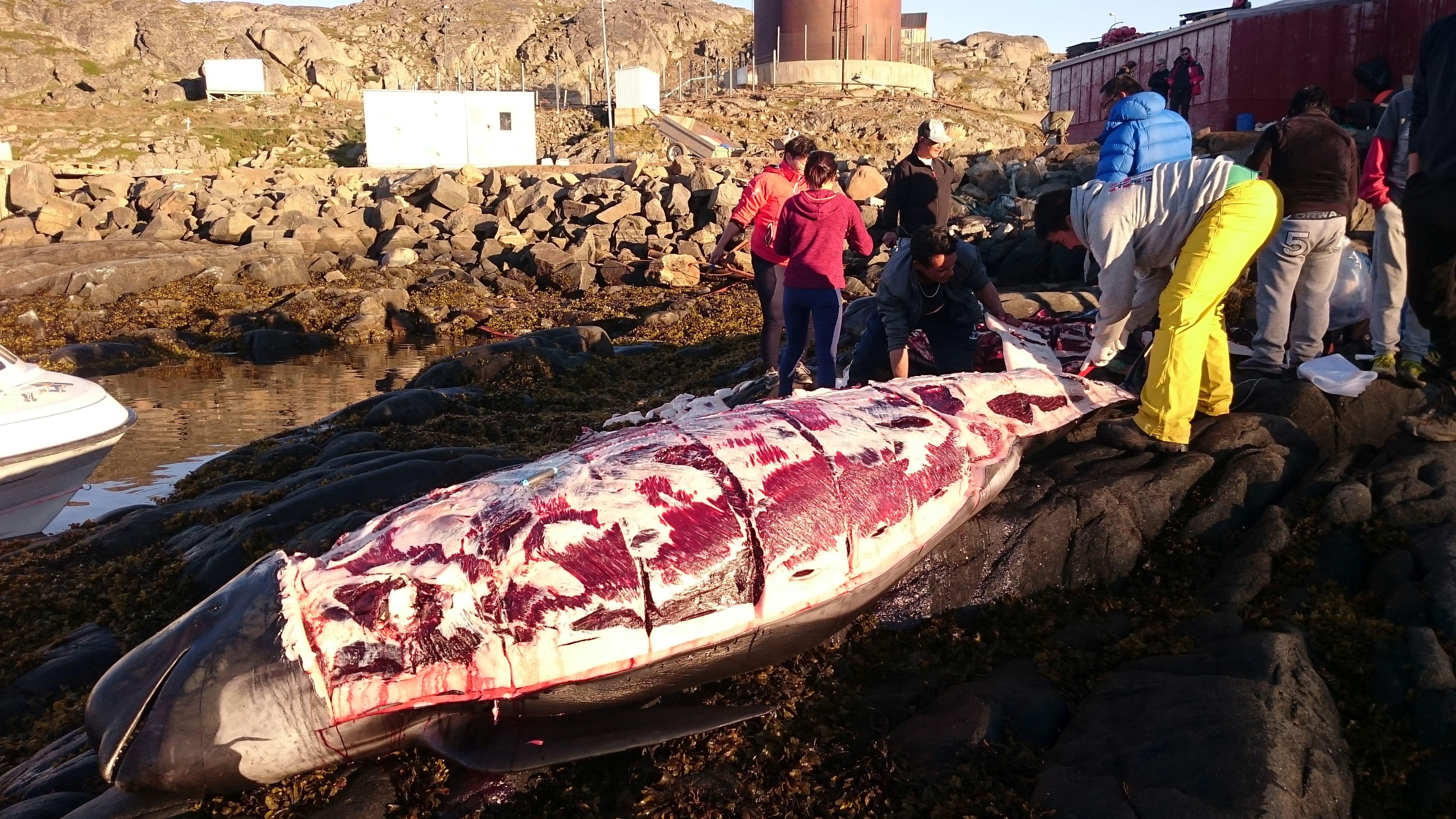 Natomiast udało mi się uczestniczyć w wyciąganiu takiego wieloryba na plażę i ćwiartowaniu go, a potem w dzieleniu mięsa pomiędzy rodziny tych, którzy brali udział w polowaniu. To mocno niecodzienny widok. Chodziłem po osadzie i trafiłem na myśliwych mocujących się z cielskiem wieloryba, żeby wyciągnąć je na brzeg. W pierwszej chwili byłem intruzem, jak zobaczyli aparat, zaraz mówili „no photo, no photo” - mają złe doświadczenia z białymi, którzy najpierw nagrywają, fotografują, a potem robią wielki skandal z tego, że tamci polują na wieloryby. A dogadać się nie jest prosto, bo prawie nikt tam nie mówi po angielsku. Posługują się dialektem wschodniogrenlandzkim, oficjalny język to zachodniogrenlandzki, a duński to już jest dla nich język obcy. To pomyślmy, ile osób w Polsce, zwłaszcza na prowincji, mówi w trzech językach? I u nich tak samo jest z angielskim – to rzadkość.
