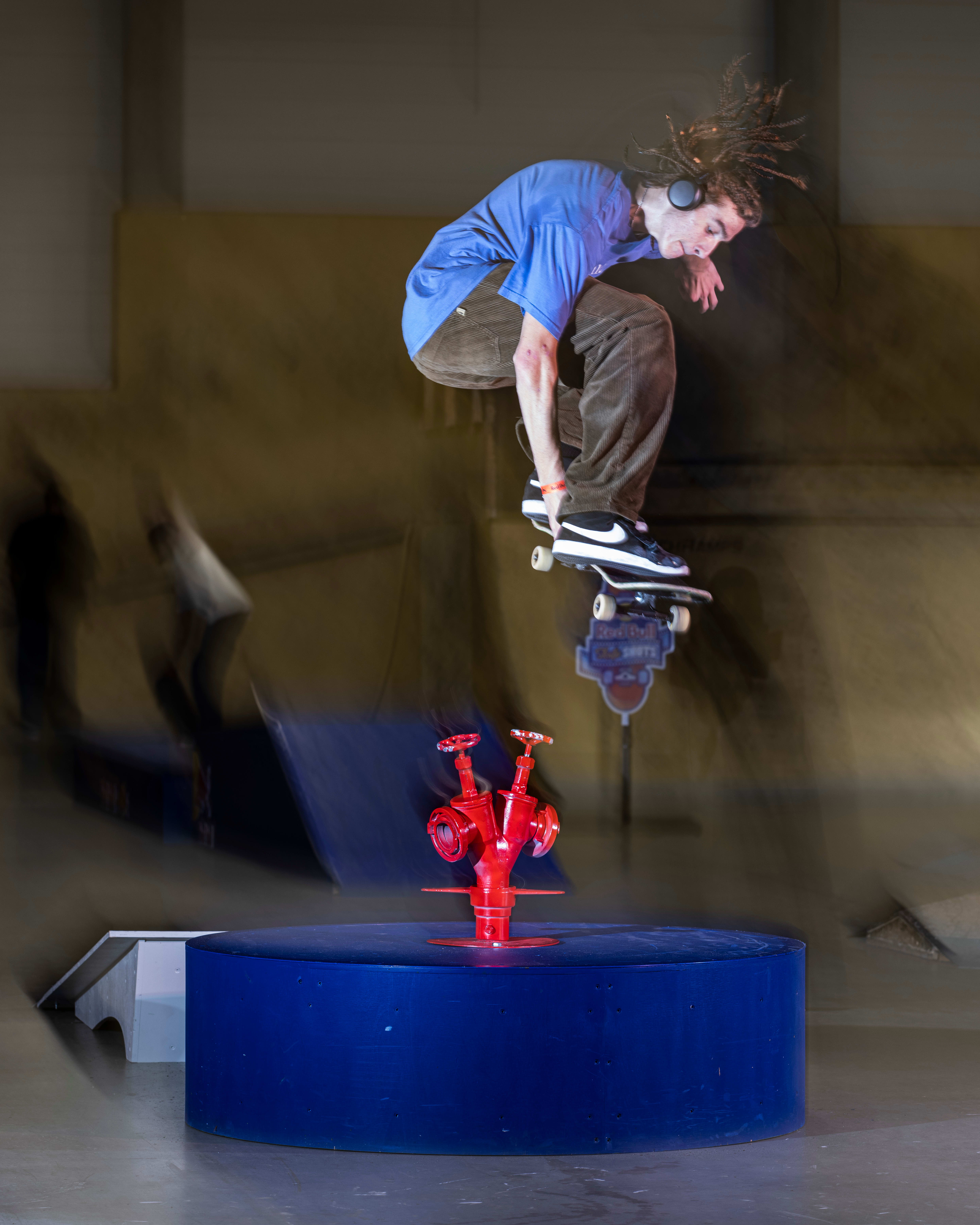 Myślę, że najtrudniejszą rzeczą przy tego typu wydarzeniach jest synchronizacja wielu różnych elementów względem siebie i czasu. Umiejętność szybkiej reakcji i dostosowania się do dynamicznie zmieniających się warunków czy sytuacji. Musisz bez przerwy obserwować sytuacje na całym parku, czy gdzieś nie dzieją się ważniejsze rzeczy do udokumentowania, i czy coś Cię właśnie nie omija. Kontrolowanie stanu baterii w aparacie czy lampach, tak aby nie dopuścić do sytuacji, gdzie któryś podzespół przestanie pracować, ustawienie lamp błyskowych względem przeszkody, skejta i triku, który wykonuje. Manewrowanie nimi, tak aby każda sztuczka i ruch była możliwie najlepiej doświetlona i czytelna, a przy tym statyw nie przeszkadzał w jeździe. Myślę, że ilość szczegółów i krótki czas na wykonanie zdjęcia potrafią być problematyczne przy tego typu reportażu. Jest bardzo dużo detali nad którymi trzeba pamiętać, aby później materiał dobrze i spójnie się prezentował. 150% focus.