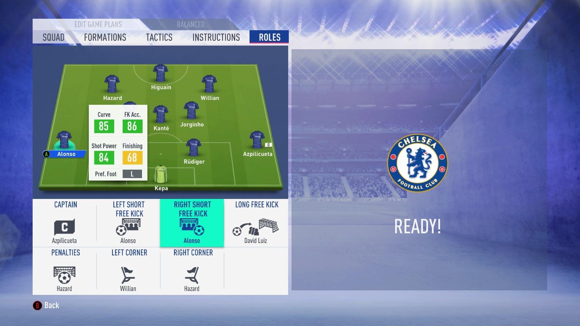Alonso, com 86 de precisão em livres, é também o melhor cobrador de faltas do plantel. No entanto, para livres mais distantes da baliza, David Luiz ou Willian são melhores opções devido à sua capacidade de remates de longa distância. Os cantos deves deixar para Willian ou Hazard, sendo este último uma boa opção também para a marcação de penalties.