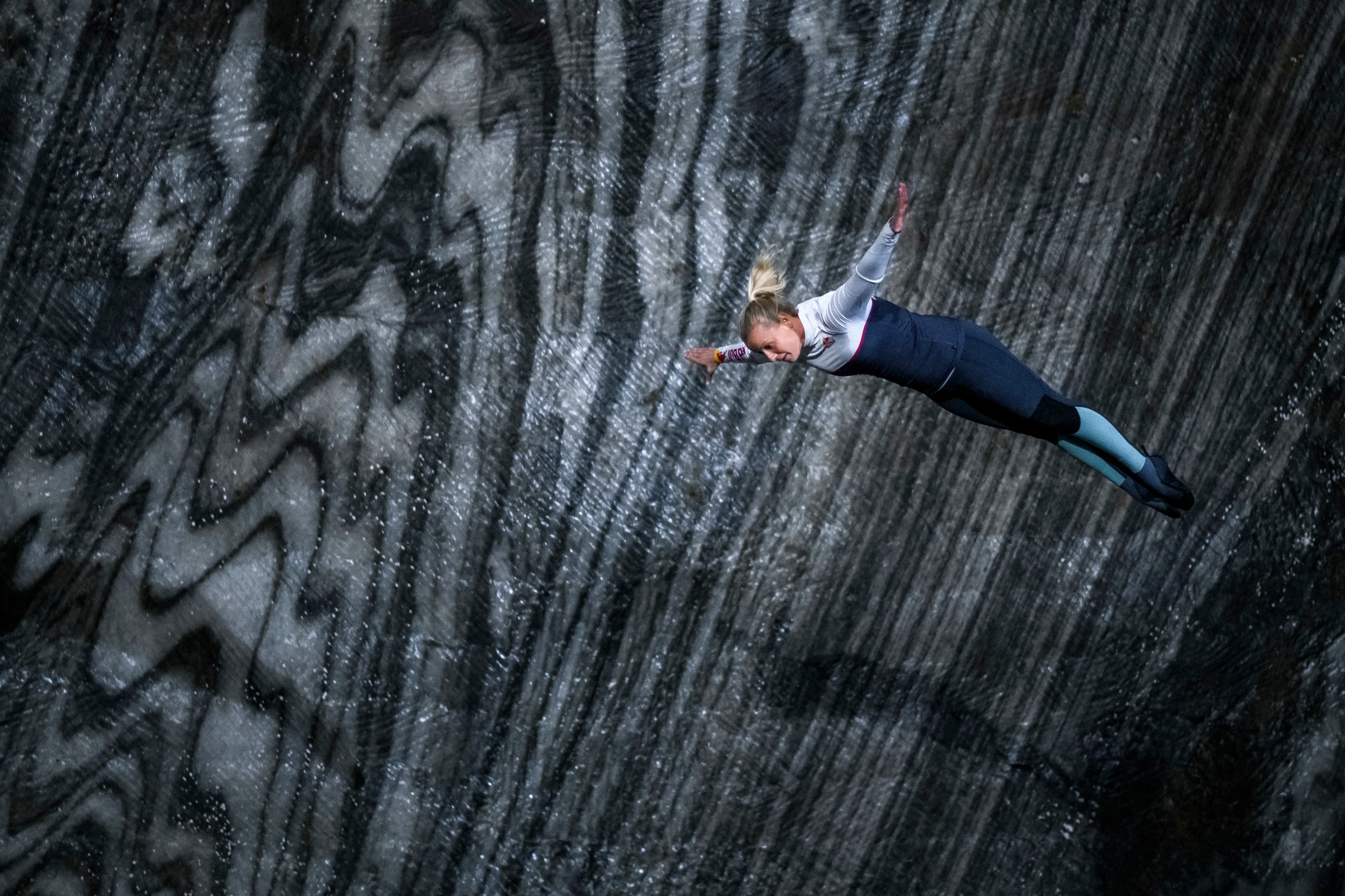 „Am reușit o premieră azi,” a spus Rhiannan, în vârstă de 29 de ani, „prima săritură subterană într-o mină de sare. E foarte întuneric în lac. Apa e cu 17% mai densă decât cea din mare, așa că impactul e diferit. E o experiență unică să lovești apa când e atât de sărată. Te împinge imediat înapoi la suprafață.