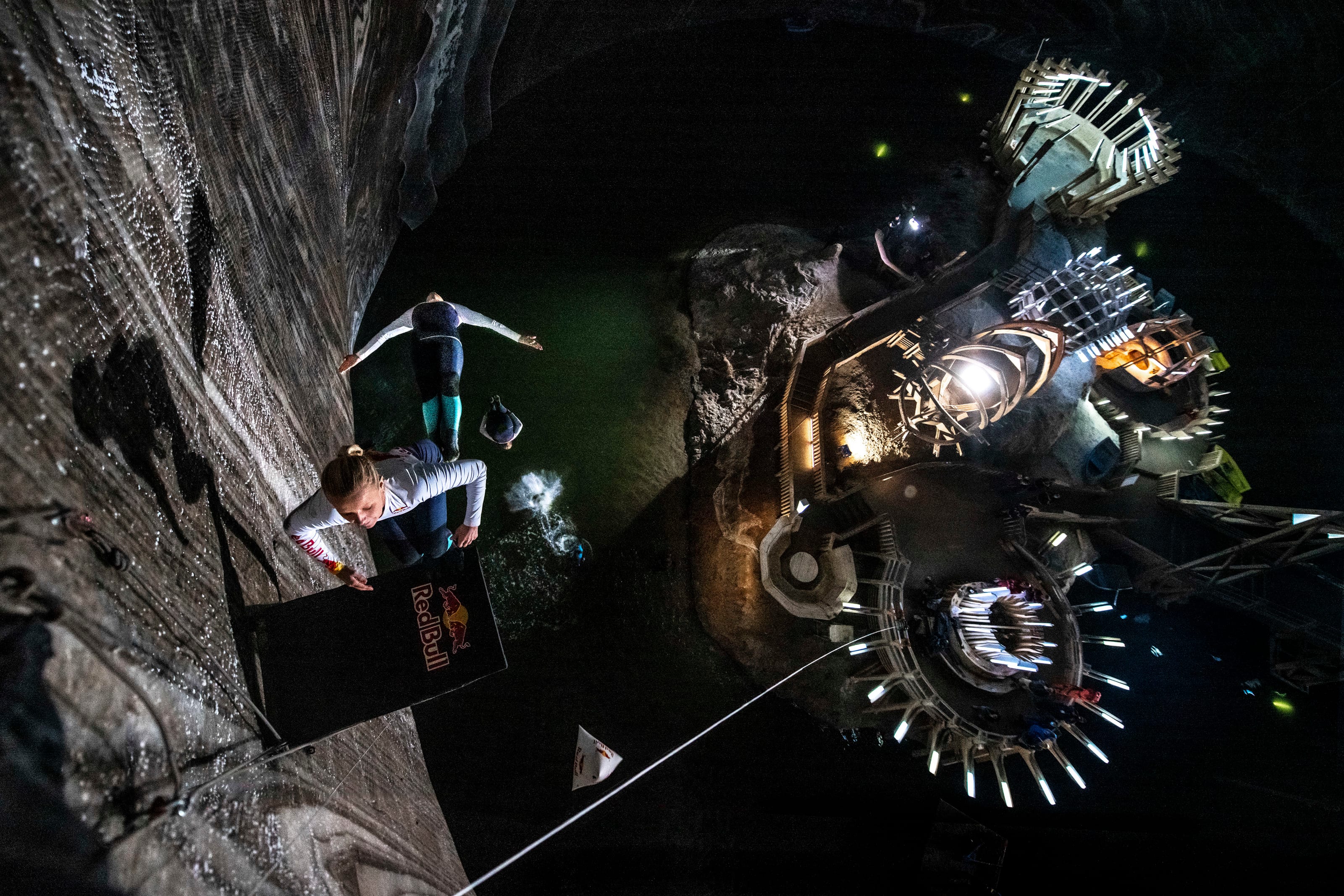 Într-o încercare cum nu s-a mai văzut, cea mai bună sportivă din cliff diving și primul sportiv român din seria mondială, Constantin Popovici, au împins limitele săriturilor de la mare înălțime la următorul nivel, după ce au plonjat de pe platforma montată pe pereții de sare ai Minei Terezia, un uriaș clopot de 90m înălțime şi 75m diametru.