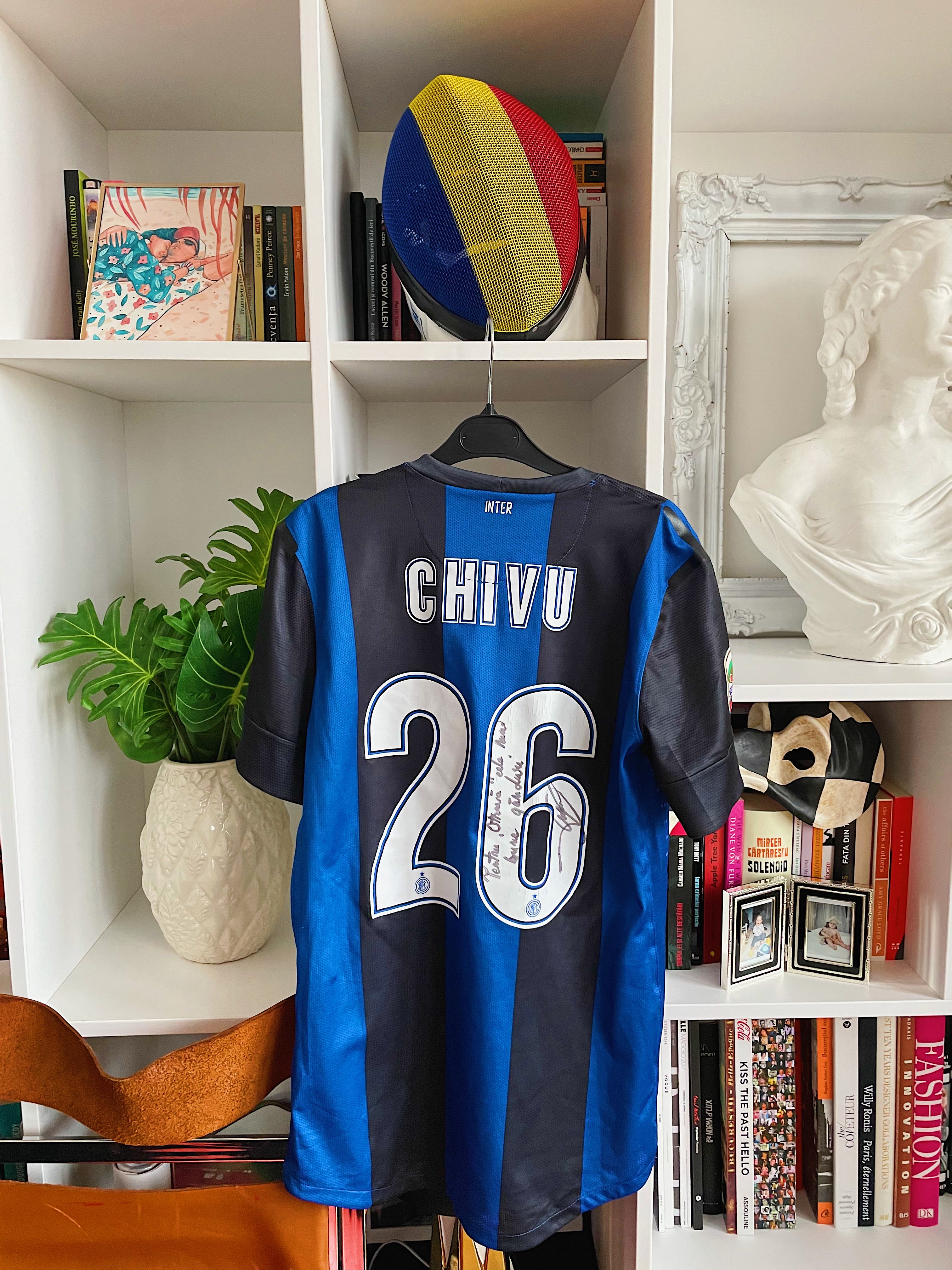 Care e povestea lui? Este tricoul de joc al lui Inter, câștigătoare de Champions League. Chivu este unul dintre jucătorii mei preferați. Povestea nu este foarte complicată. Sunt prieten cu Cristi și cu soția lui. Am fost coleg de facultate cu Adelina. Am împărțit primul nostru loc de muncă. Fix într-o redacție de sport. Pleca prietena mea Maria Apostol la Milano și, prin ea, tricoul și șortul de la Inter au ajuns la mine.