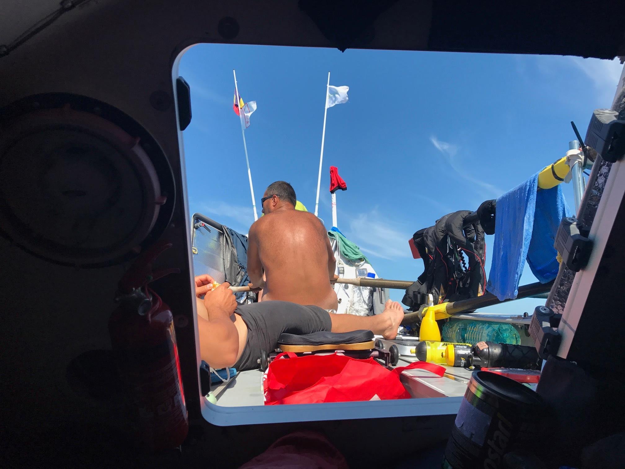 Rutina voastră a fost de 2 cu 2: două ore ați vâslit, două ore v-ați odihnit. Cum a arătat exact treaba asta?Într-adevăr, 2 ore vâslești, 2 ore stai, 2 ore vâslești și tot așa. În fine, statul ăla e relativ pentru că în primele 10 minute te speli, te schimbi, apoi mănânci ceva și pe urmă faci chestiuni administrative. Deci, în mod real, dacă prinzi o oră din cele două de somn, e magnific. Chiar și-n ora aia, somnul e însă superficial, pentru că ai acea neliniște: ești pe mare, se aud mereu zgomote în jurul tău, orice val care atinge barca ai sentimentul că o va răsturna și tot așa. Toate senzațiile se amplifică. Noi, pentru că am fost 5, am avut secvența 2-2-2-4, adică 2 ore vâslești, 2 ore stai, 2 ore vâslești, 4 ore stai, astfel încât să poată vâsli toți. Și treaba asta se tot repetă.