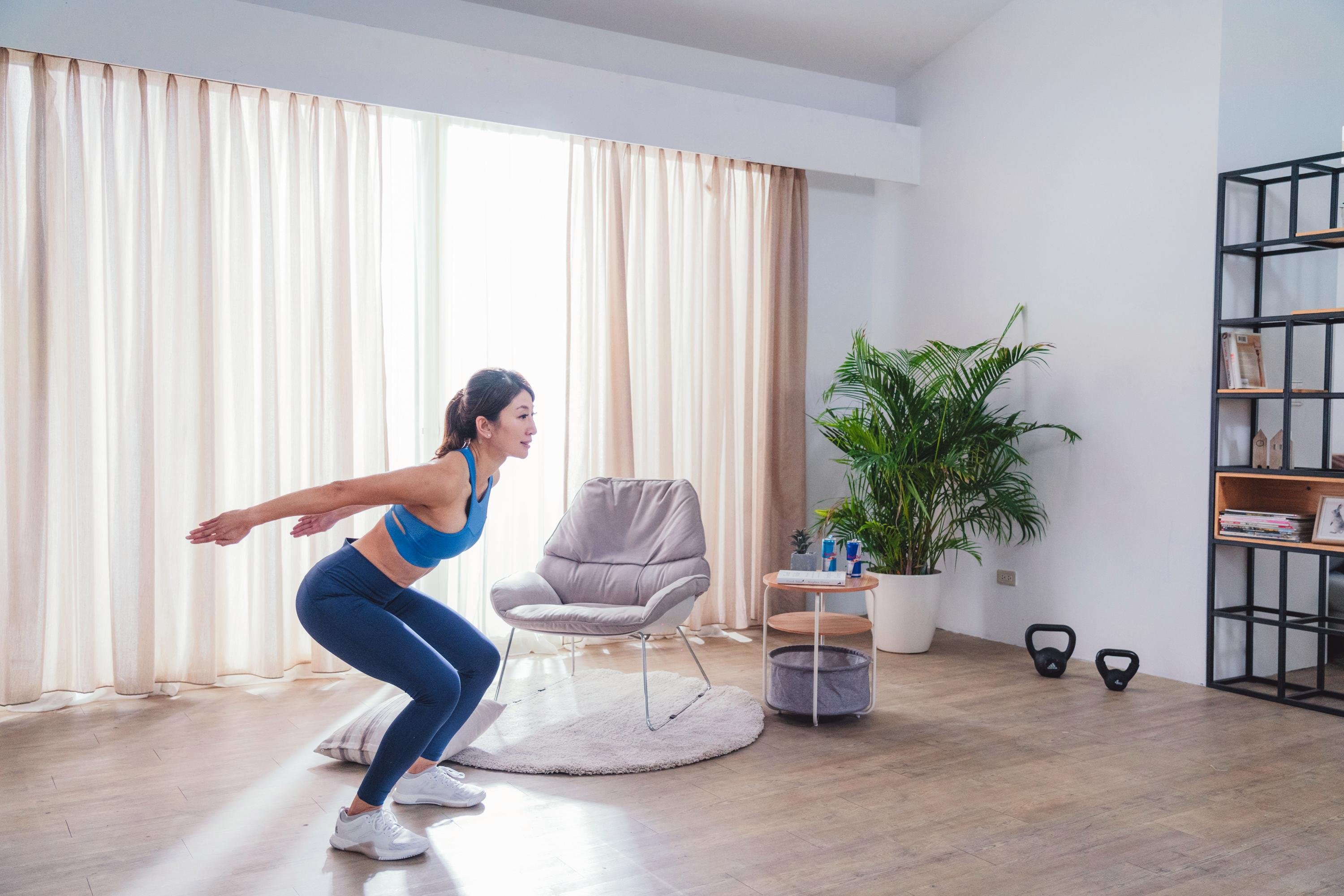 Выпрыгивания из максимального приседа с прямой спиной. 5 подходов по 6-8 повторений достаточно для тренировки четырехглавой и двуглавой мышцы бедра.