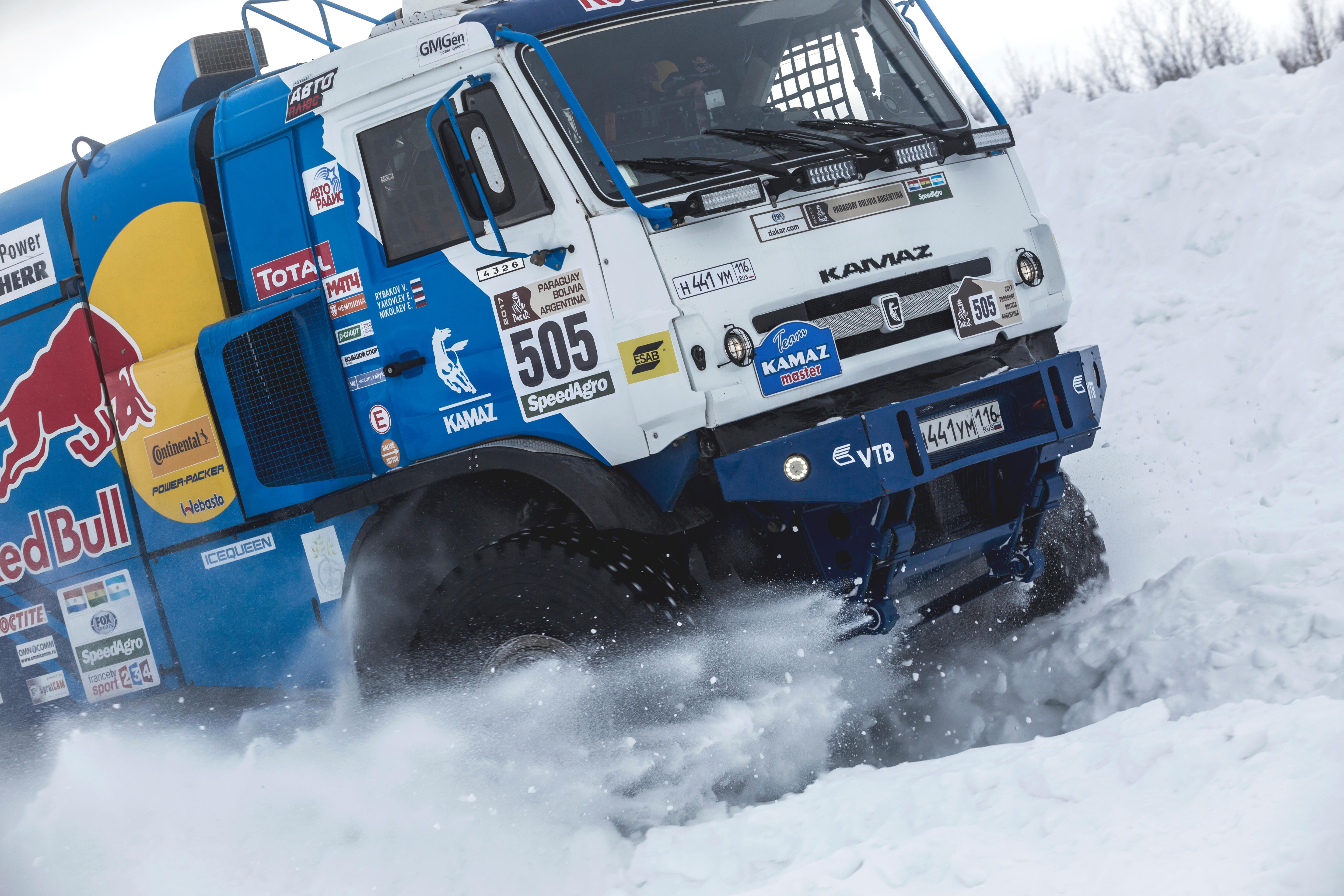 Эдуард Николаев пристегивается 5-точечными ремнями безопасности. Заводит 16-литрового дизельного монстра и «синий дракон» срывается с места. Разгон, и КАМАЗ на скорости под 140 км/ч взлетает в воздух, преодолевая расстояние более чем в 30 метров. И только 216 шипов на каждом колесе поблескивают на полярном солнце. Перегрузка в 12G не мешает при этом пилоту улыбаться мощи своего «питомца». Тесты проходят успешно, покрышки отлично держат автомобиль даже в снежной каше, подвеска выдерживает жесткие удары, правильная развесовка грузовика позволяет ему приземляться на четыре колеса одновременно не зарываясь «носом» и продолжать движение на максимальной скорости. Только подвергая себя и машину экстремальным нагрузкам пилоты могут быть уверены, что во время настоящей гонки техника их не подведет.
