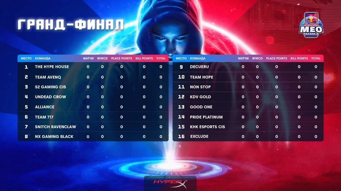 Региональный этап Red Bull M.E.O. по PUBG Mobile разделен на два этапа: четыре онлайн-квалификации и большой финал. Весь ноябрь лучшие бойцы сражались в отборочных матчах, чтобы выяснить имена команд, достойных участия в финале. Из каждой квалификации было отобрано по 8 коллективов с наилучшим результатом — таким образом, сформировалось топ-32 команды всего турнира. Именно им и предстояло сражаться за главный приз — выход на международный гранд-финал и море призов от Red Bull и HyperX. В полуфинале мы простились с половиной команд.