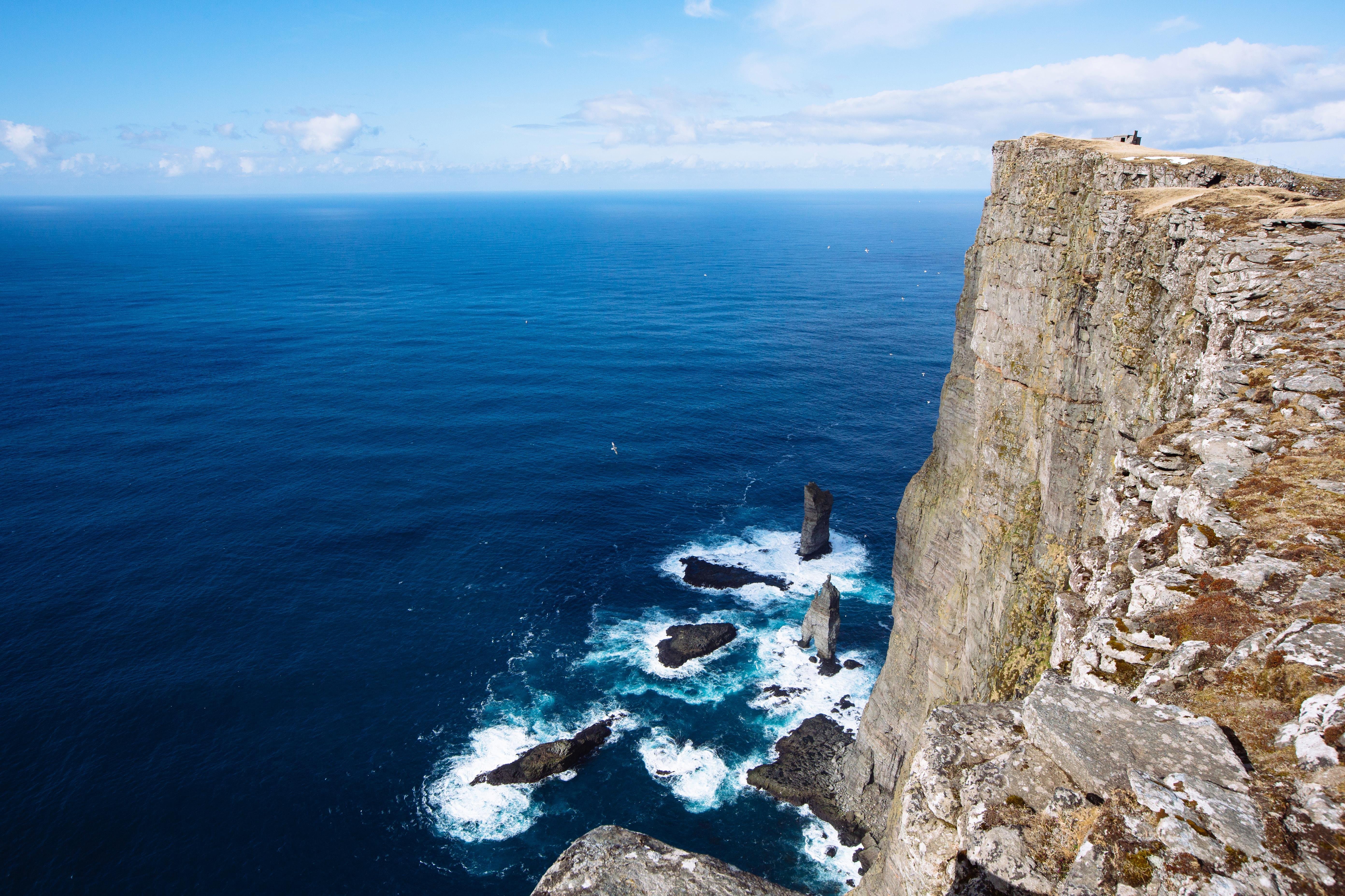 This is a pair of sea stacks whose names mean The Giant and The Witch. The former was first climbed in 2008, the latter in 2013 – but with the harsh winter storms the Witch, which sits on two legs, is tipped to fall in the next few decades.