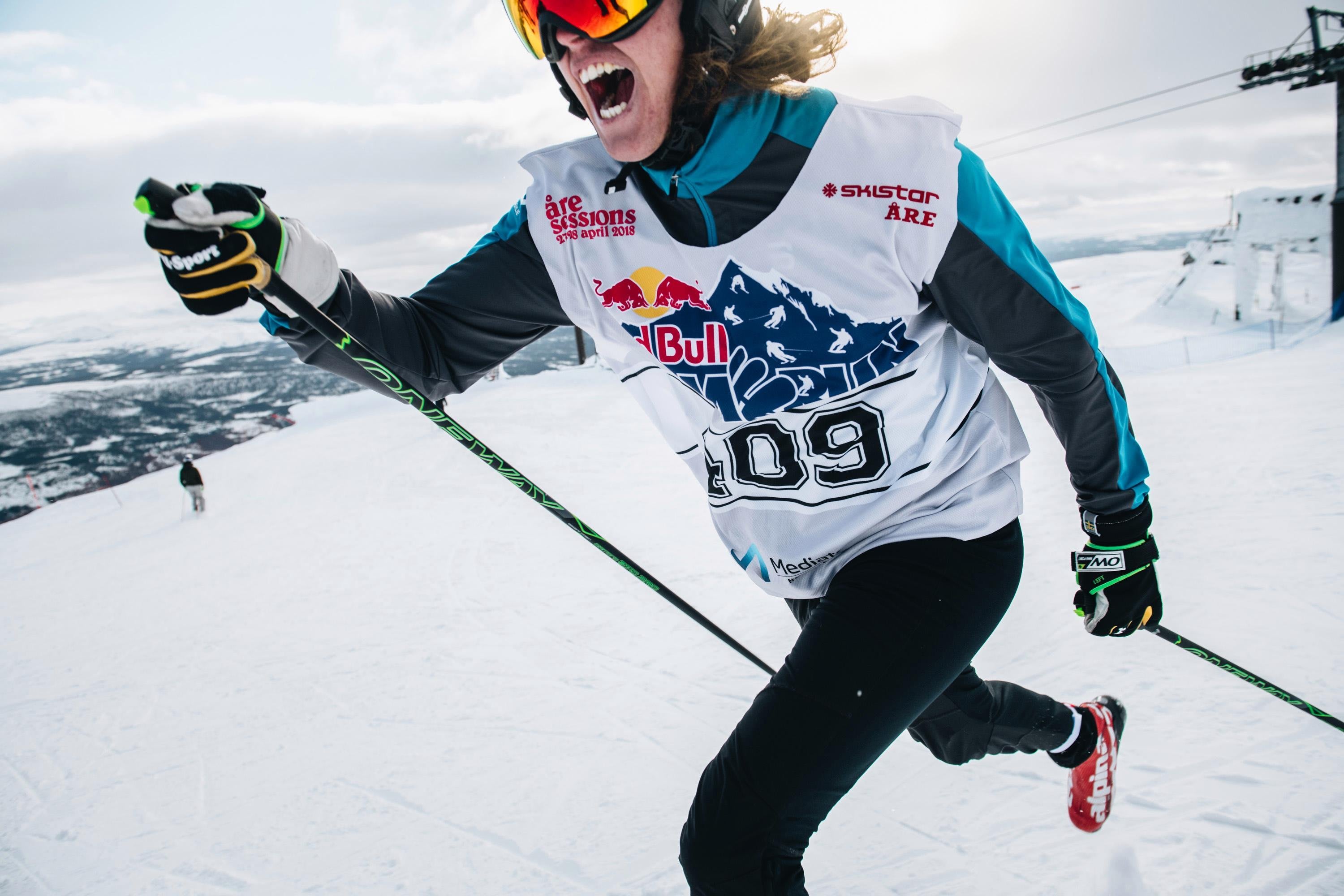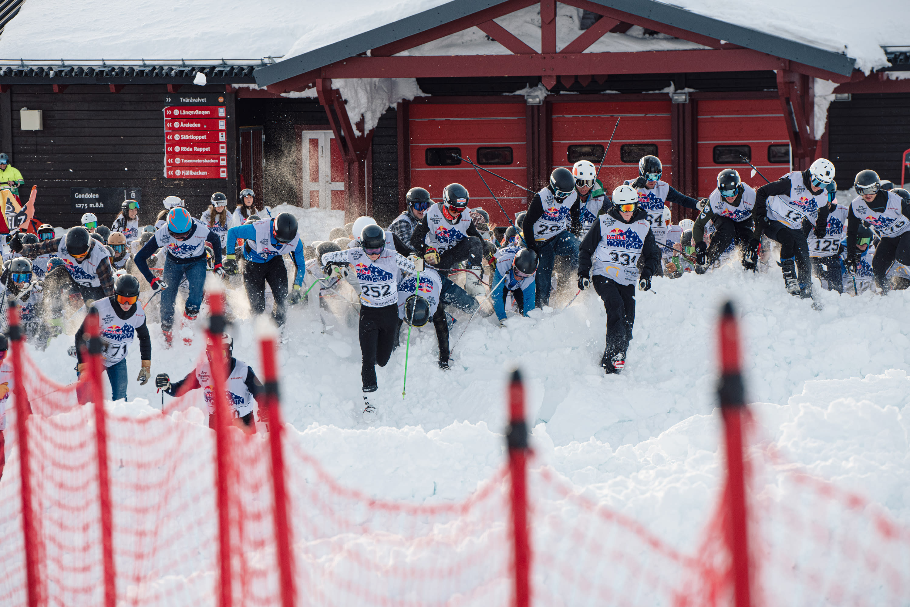The race begins with a masstart run. All competitors are lined up side-by-side and, once the start signal sounds, sprint across a field full of snow obstacles to their skis or board. Then it's time to strap into the gear and set off down the marked route: a mix of steep pistes, high-speed corners as well as flatter cat track sections. The race finishes once the racers have passed through the Red Bull arch at the bottom, by Timmerstugan.