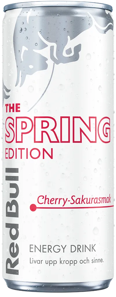 Red Bull Spring Edition med smak av körsbär och sakura med avslutande noter av mandel.