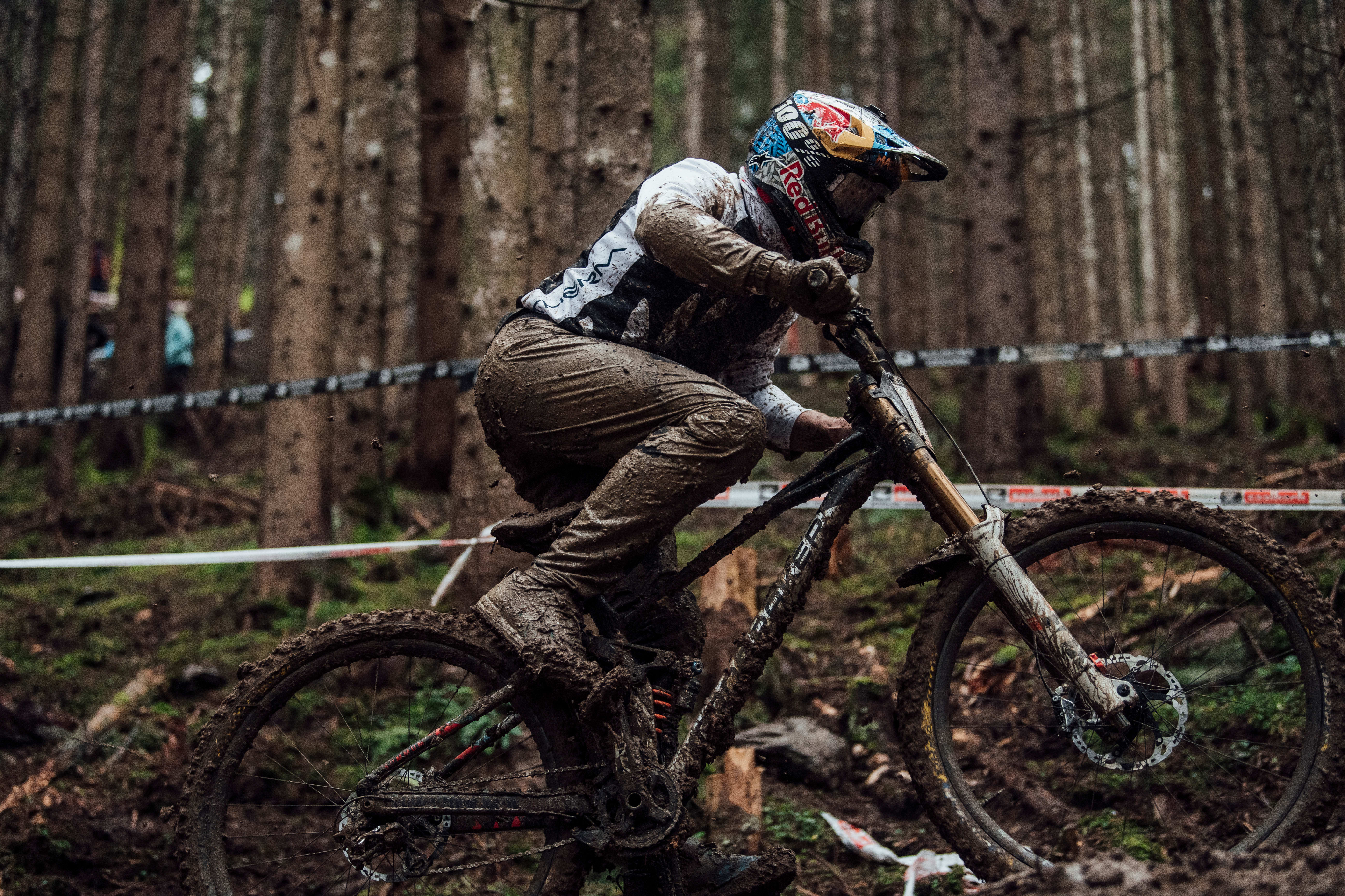 Brook MacDonald's 2020 Glaser helmet stands out against the mud of Leogang