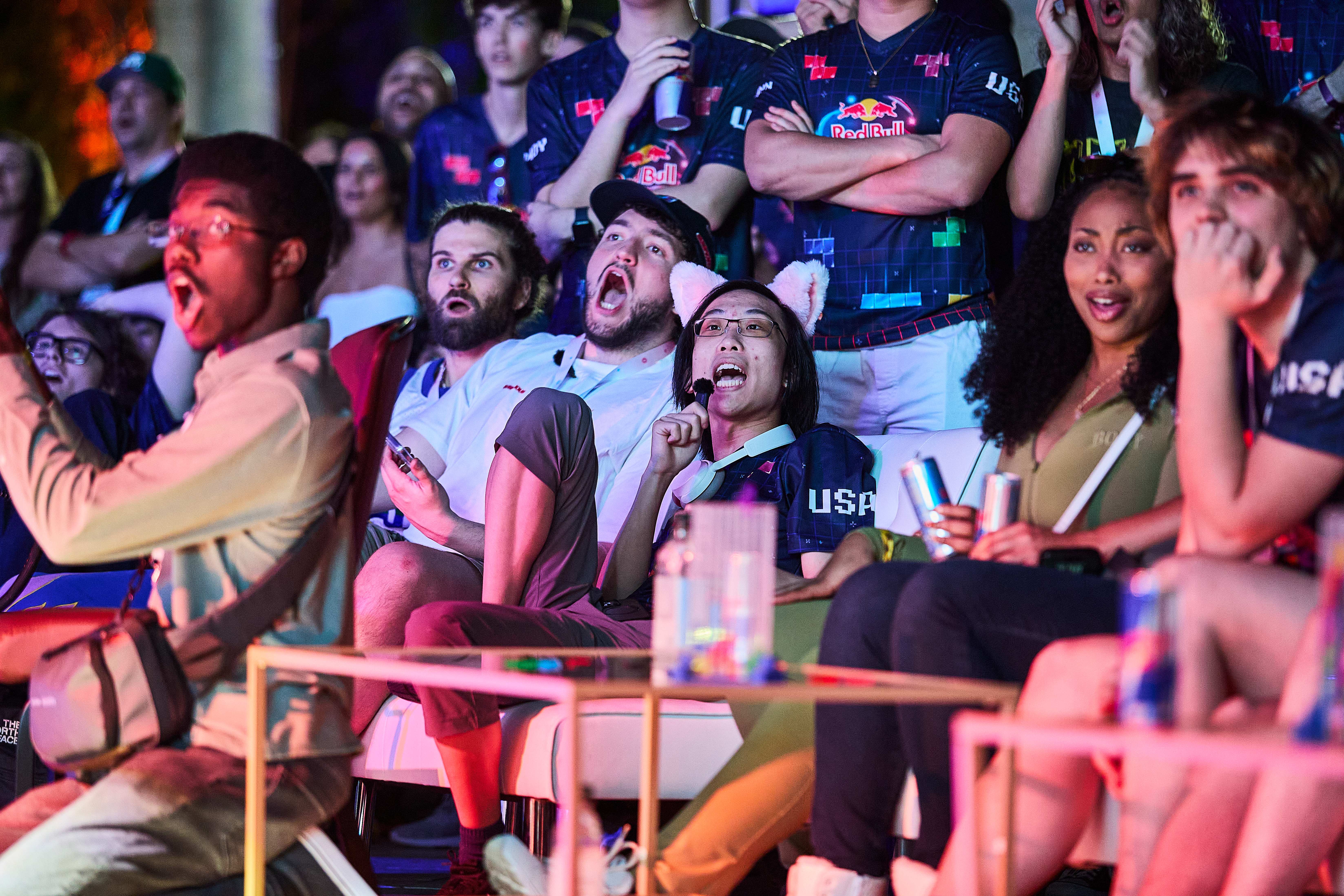 Players Coldless and Sodium react during a close match at the Red Bull Tetris® US National Final in Hollywood, Florida, USA on November 22, 2025.