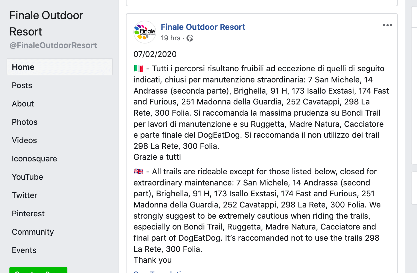 Vsak dan na Facebook strani objavijo poročilo za naslednji dan, s seznamom trejlov, ki so iz tega ali onega razloga zaprti. Na to se lahko zaneseš in če seznam upoštevaš, ne bo nikoli slabe volje zaradi zapravljenega spusta. Mogoče se to komu zdi samoumevno, a Finale ni bike park kjer so trejlbilderji plačani iz prihodkov od prodaje vozovnic za žičnico, poleg tega je mreža ligurskih trejlov zelo obsežna. Tu ni enega velikega upravljalca parka, ki bi služil s trejli in jih s tem tudi financiral. Mnogo malih firm in posameznikov s shutlanjem in vodenjem, pa tudi namenskimi nastanitvami, služijo vsak po svoje. Zato so imeli v preteklosti tudi težave, saj niso vsi enako prispevali v urejanje. Z ustanovitvijo konzorcija se je to kar dobro uredilo, ugotovili so namreč, da so skupaj močnejši!