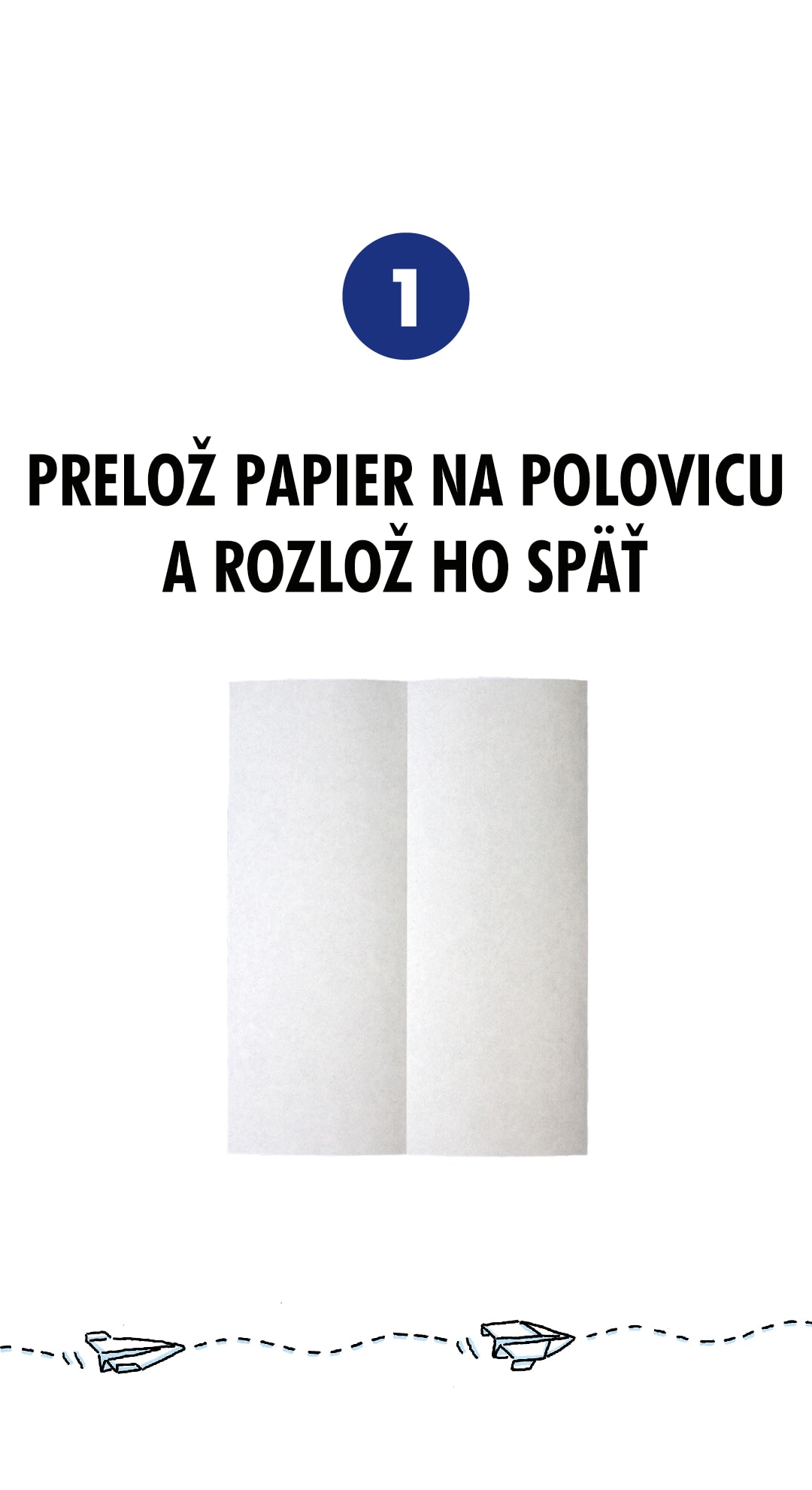 1. Prelož papier na polovicu, aby v strede vznikol záhyb. Aby malo lietadielko dobrú rovnováhu, neponáhľaj sa a pozorne zarovnaj protiľahlé okraje. Potom ho rozlož späť, ako keď otváraš knihu.