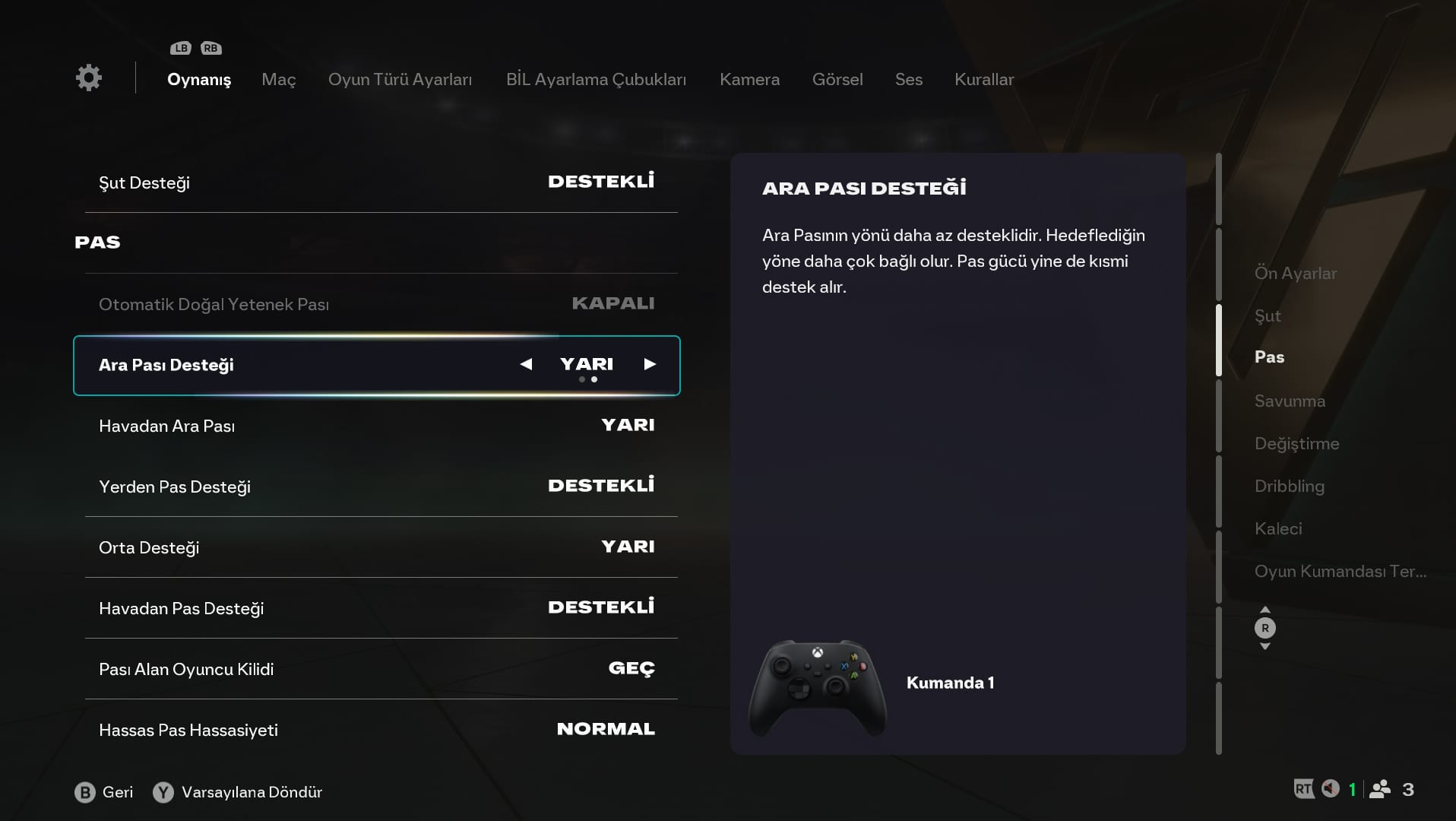 İki kez kontrol etmen gereken önemli ayarlardan biri Pası Alan Oyuncu Kilidi'dir. Bunu "Geç" olarak ayarlandığından emin ol çünkü bu, pas yönünü değiştirmek için son ana kadar sana zaman tanıyacak ve topu tutma şansını en yükseğe çıkaracaktır.