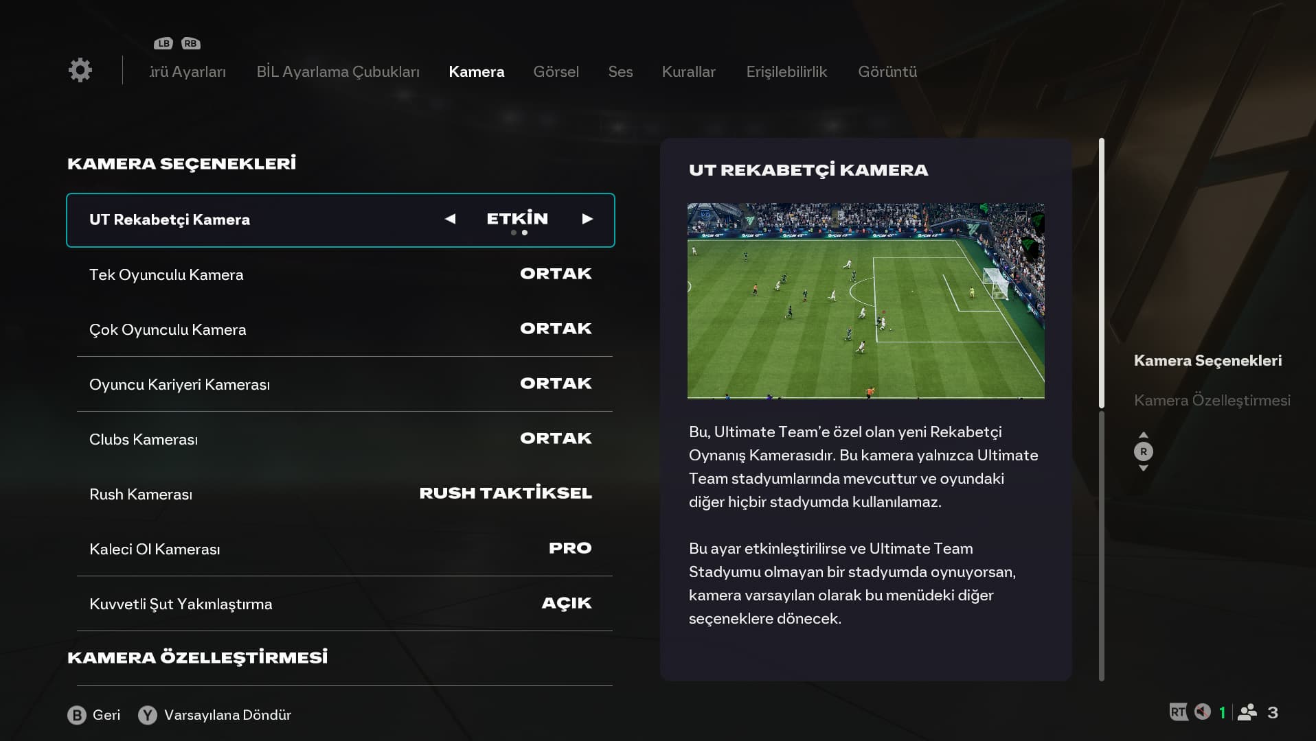 EA FC 26'da yepyeni bir kamera ayarı var. Bunun adı UT Rekabetçi Kamera ve yalnızca Ultimate Team stadyumlarında kullanılabiliyor. Bu ayar etkinleştirilmişse ancak bir Ultimate Team stadyumunda oynamıyorsan, oyun diğer tercihlerine dönecek.