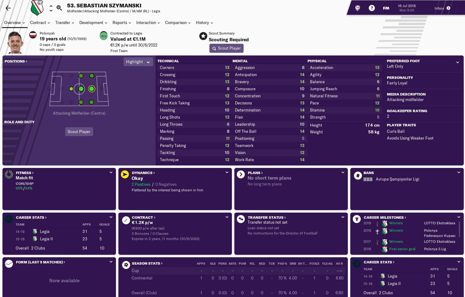 Polonya, kanat ve forvet oyuncusu çıkarmakta hiç de zorlanmayan bir futbol ülkesi. Legia’nın 19 yaşındaki yeteneği Szymanski de onlardan biri. Strength dışında bütün özellikleri iyi olan oyuncuyu 1 milyon Pound’a kapmak mümkün. Elimizi çabuk tutalım!