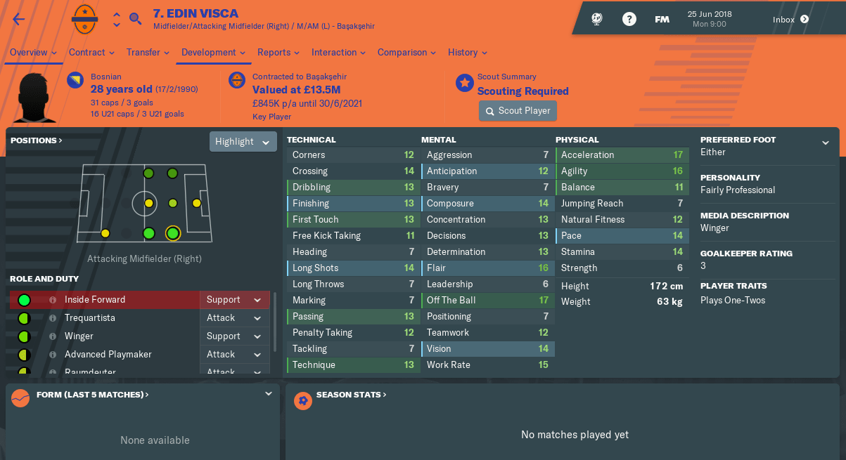 Edin Visca da gerçek hayatta neyse FM 2019’da da o. Özellikleriyle tam bir kenar forvet havası veriyor. Zaten 13.5 milyon pound’luk değere sahip. Strength konusunda biraz haksızlık yapılmış ama neyse…