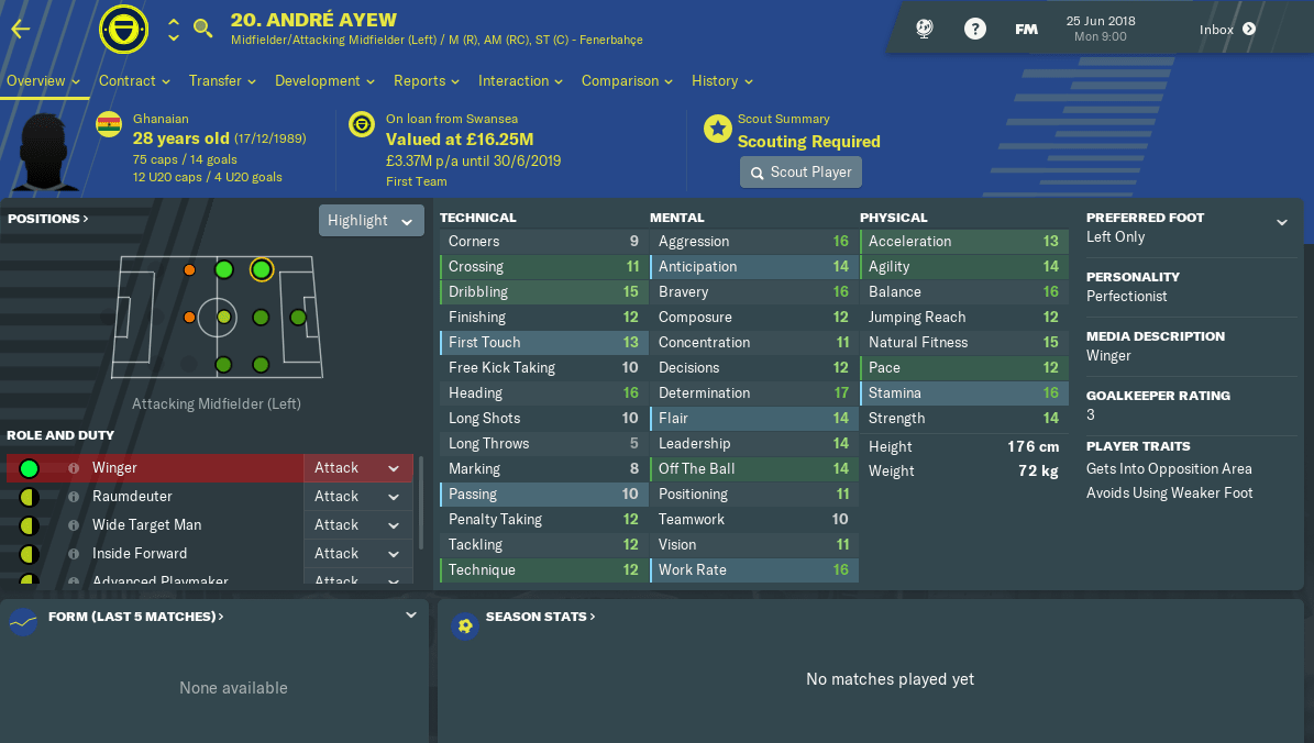 Yine Premier Lig’den Süper Lig’e kiralanan bir başka isim. Andre Ayew de özellikleriyle iyi bir kenar forvet izlenimi sunuyor. Work Rate’i FM 2019’da 16, bu özelliğini henüz kendi ligimizde göremedik sanki ama olsun…