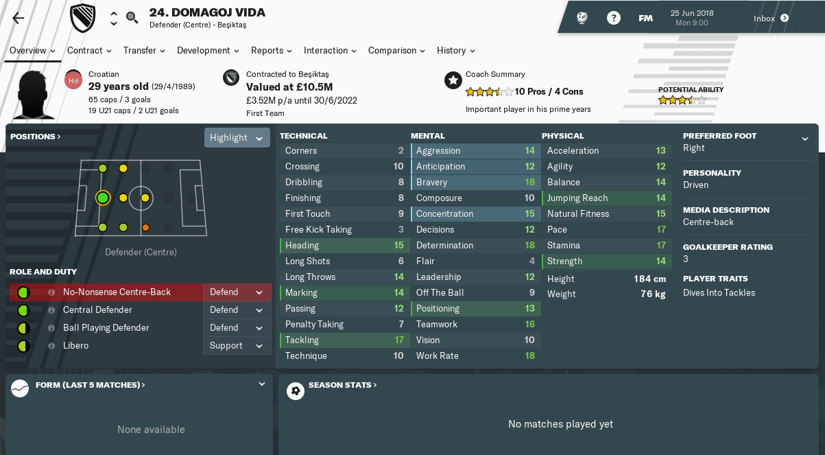 Bir başka Beşiktaşlı oyuncu Vida’nın da Dünya Kupası’nda gösterdiği performansı FM 2019 tarafından ödüllendirilmiş gözüküyor. Doğrusu söylemek gerekirse profili gayet özenli ve gerçekçi yapılmış gibi. Örneğin Work Rate özelliğinin 18 ancak Positioning’inin 13 olması gibi.