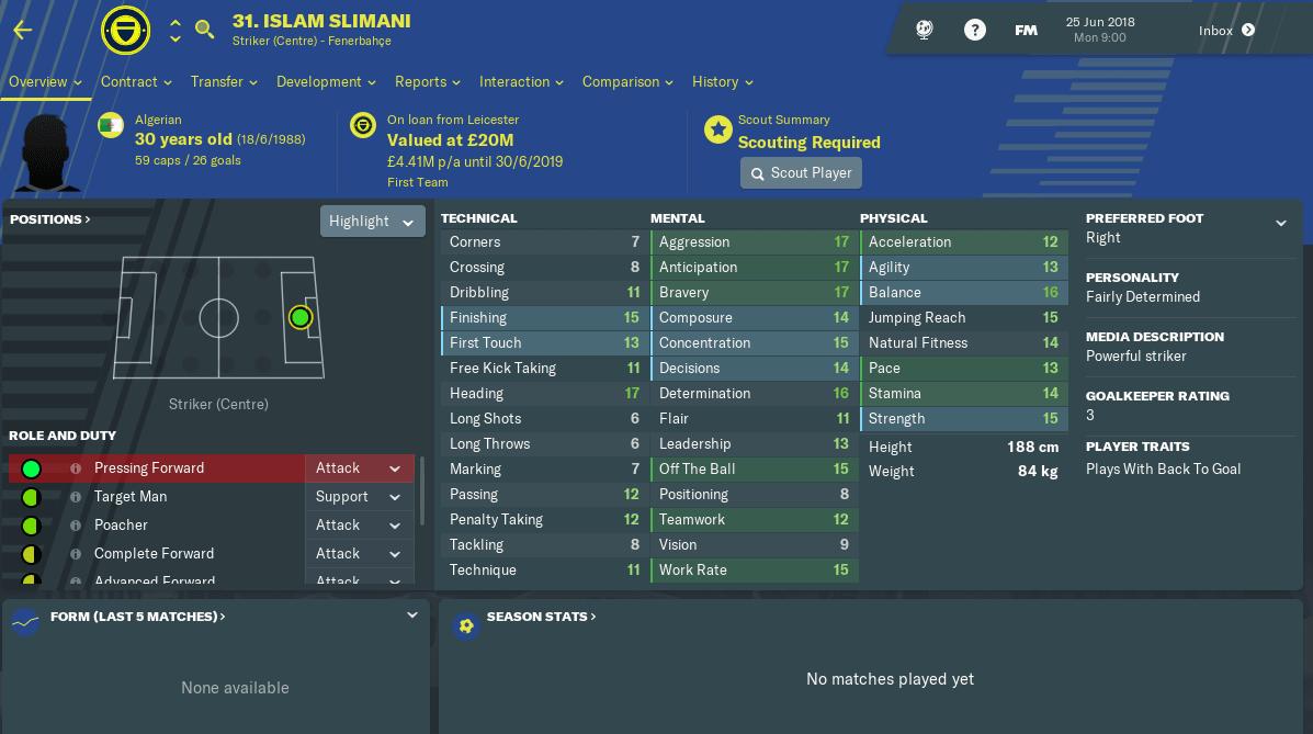Gerçek hayatta Fenerbahçeliler açısından büyük hayal kırıklığı yaratan Slimani, FM 2019’daki profiliyle şahane bir “Target Striker” havası veriyor. Oyuncu fizik olarak çok güçlü ve bununla birlikte hız, hızlanma özellikleri de hiç fena değil. Haliyle değeri de 20 milyon pound.
