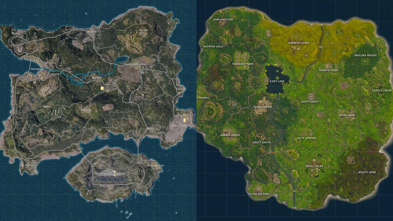 Yaklaşık bir yıl önce çıkış yapan PUBG’nin ilk haritası Erangel ve sonradan gelen ikinci haritası Miramar 64 km2 boyutunda ve 100 kişiye fazlasıyla yeten, hatta kimi maçlarda uzun süre düşman görülememesini mümkün kılan bir çapta. Öte yandan haritanın bir ucundan diğer ucuna yaya olarak gitmek tam bir eziyet olabiliyor. Erangel’in yoğun bitki örtüsü düşmanların fark edilmesini zorlaştırırken, Miramar’ın kuraklığı çok daha net bir görüş sunuyor. Fortnite’ın an itibariyle sahip olduğu ve 5,5 km2’lik tek harita ilk çıkışında inilebilir bölge ve çeşitlilik açısından yeteri kadar zengin değildi, sonrasında gelen güncellemeyleyse bu sorun giderildi. Haritanın farklı noktalarına farklı bitki örtüleri ve şehirler eklenmesi çeşitlilik noksanlığını ortadan kaldırdı.