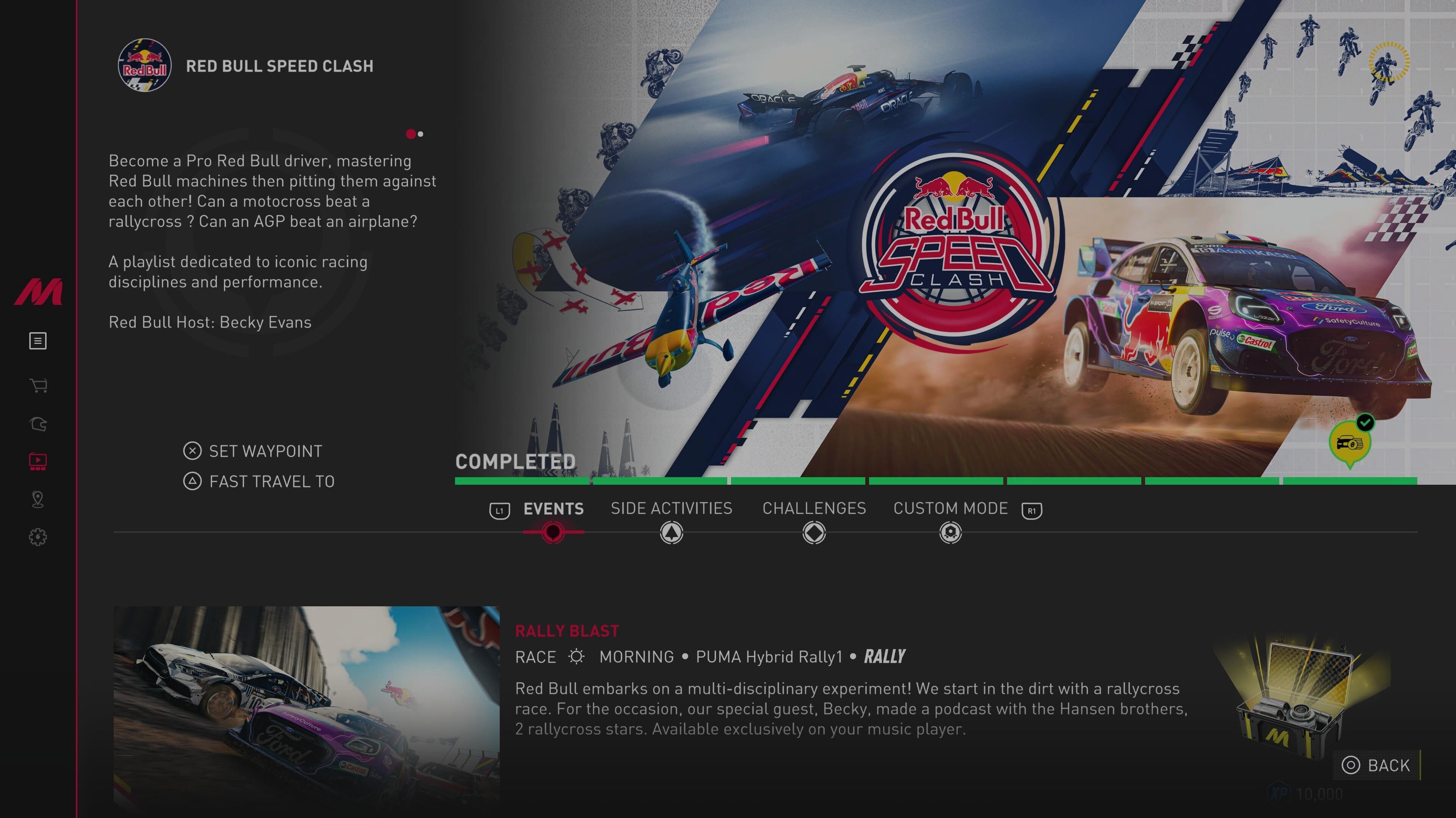 Adada tamamlanabilecek pek çok başarı ve görev bulunuyor, ayrıca Red Bull Speed Clash yarış listesinin tamamı da burada yer alıyor. Sezon 6'da eklenen bu liste, Max Verstappen'in RB20 F1 aracı dahil olmak üzere ikonik Red Bull araçlarına atlama fırsatı sunan heyecan verici bir içerik.